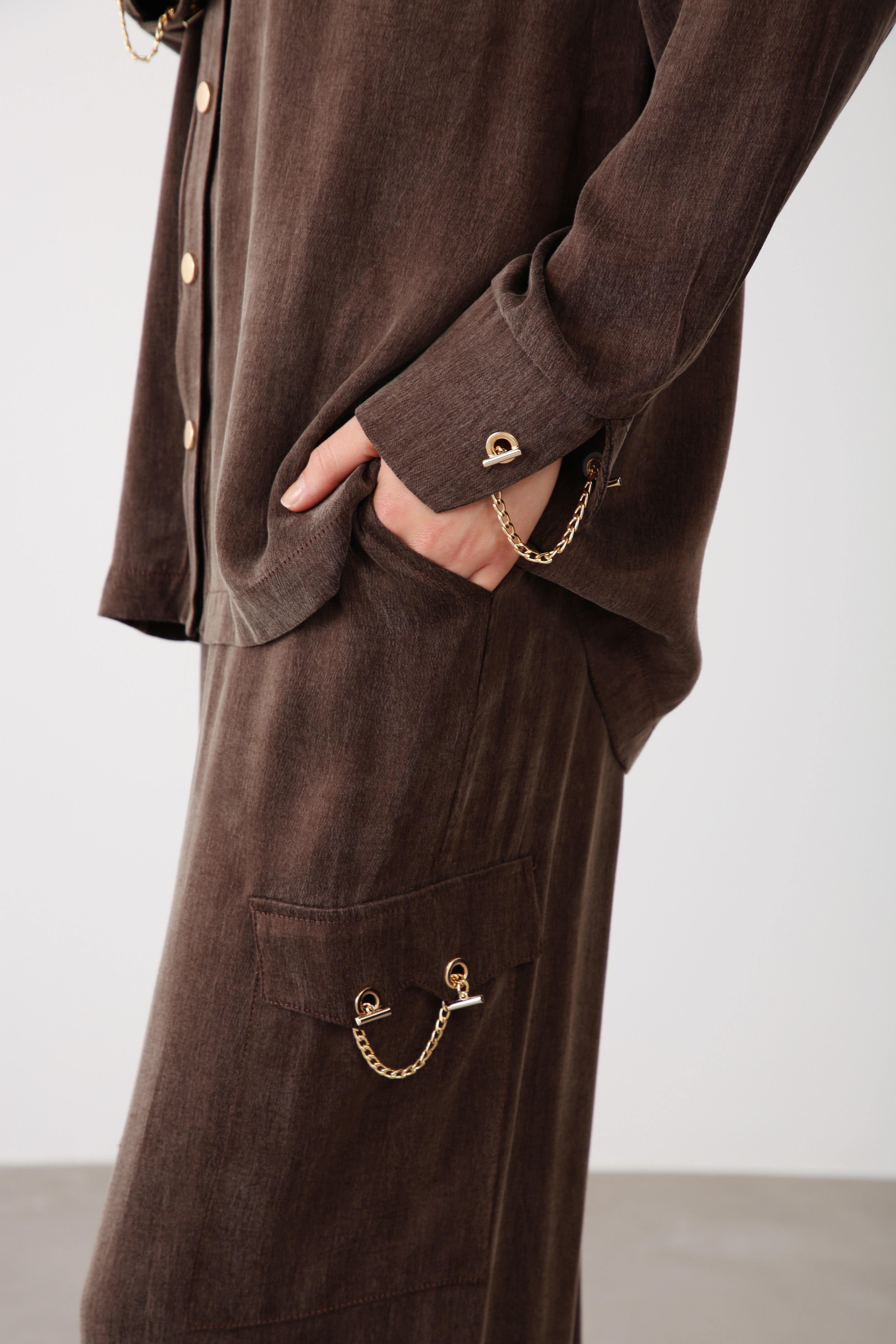 These coffee-toned pants, made from luxurious Cupra fabric, redefine effortless sophistication. The fluid texture creates an elegant drape, while the wide-leg silhouette enhances comfort and movement. Gold chain accents add a subtle touch of refinement, turning a simple design into a statement piece.