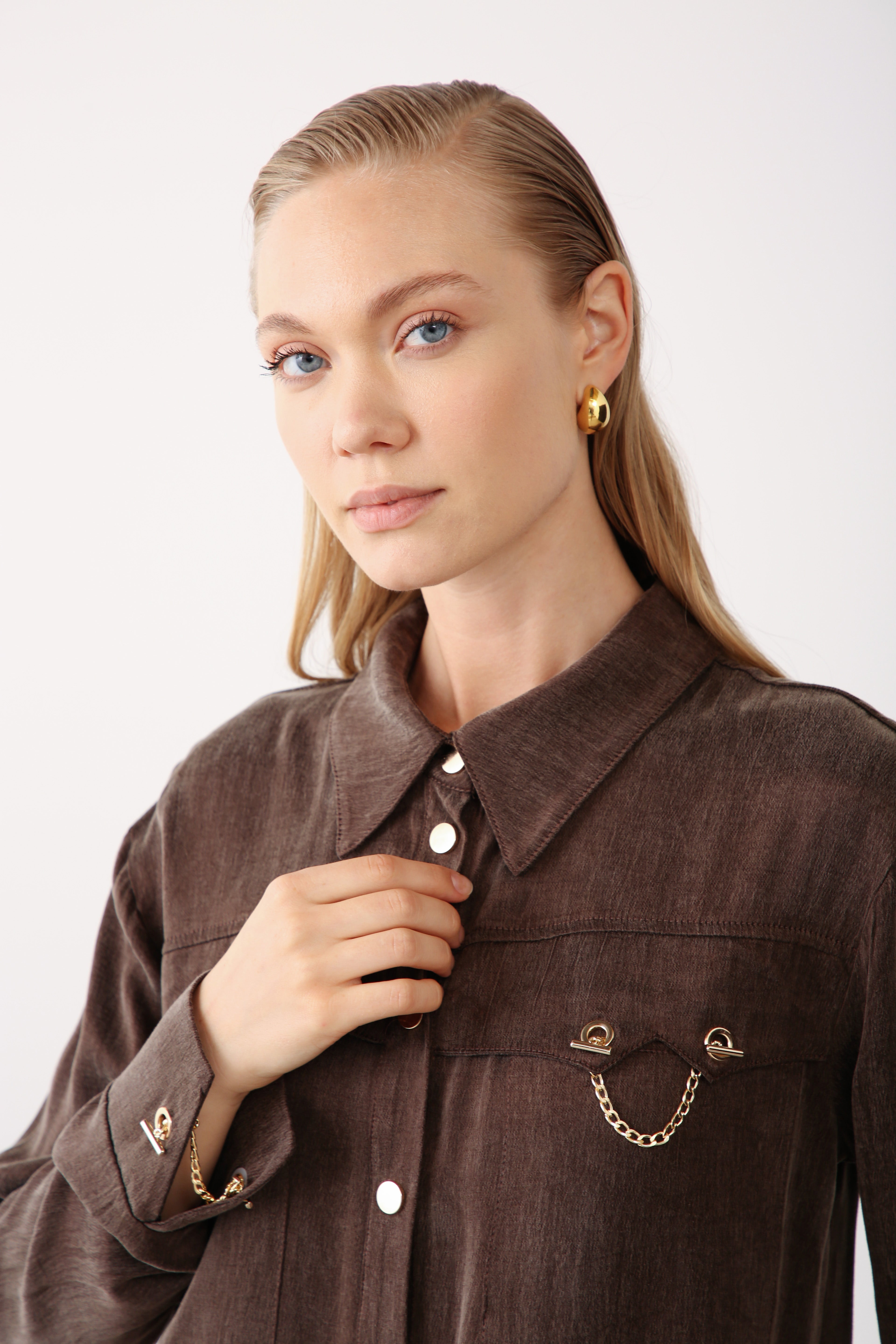 Tailored from soft and breathable Cupra fabric, this coffee-toned shirt brings understated luxury to everyday dressing. Its smooth drape enhances the silhouette while the golden eyelet and chain accents lend a refined edge to the relaxed structure. The fabric’s natural sheen creates depth and dimension, balancing elegance with ease.
