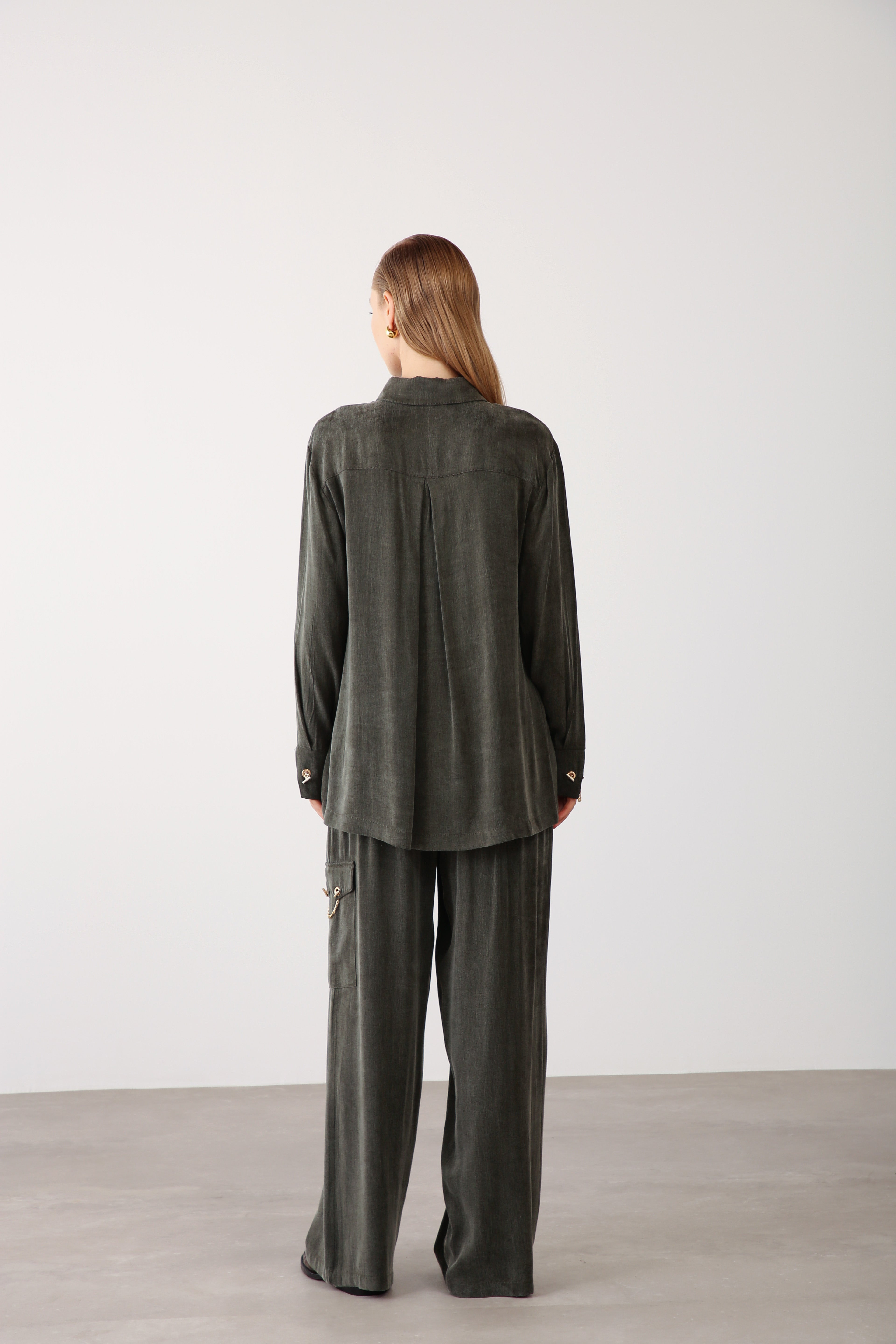 Crafted from soft and breathable Cupra fabric, this khaki shirt stands out with its distinctive chain and gold eyelet accents. The fabric’s natural sheen enhances the silhouette, offering a luxurious yet relaxed appeal. Designed for comfort and style, it drapes gracefully on the body while maintaining a polished finish.