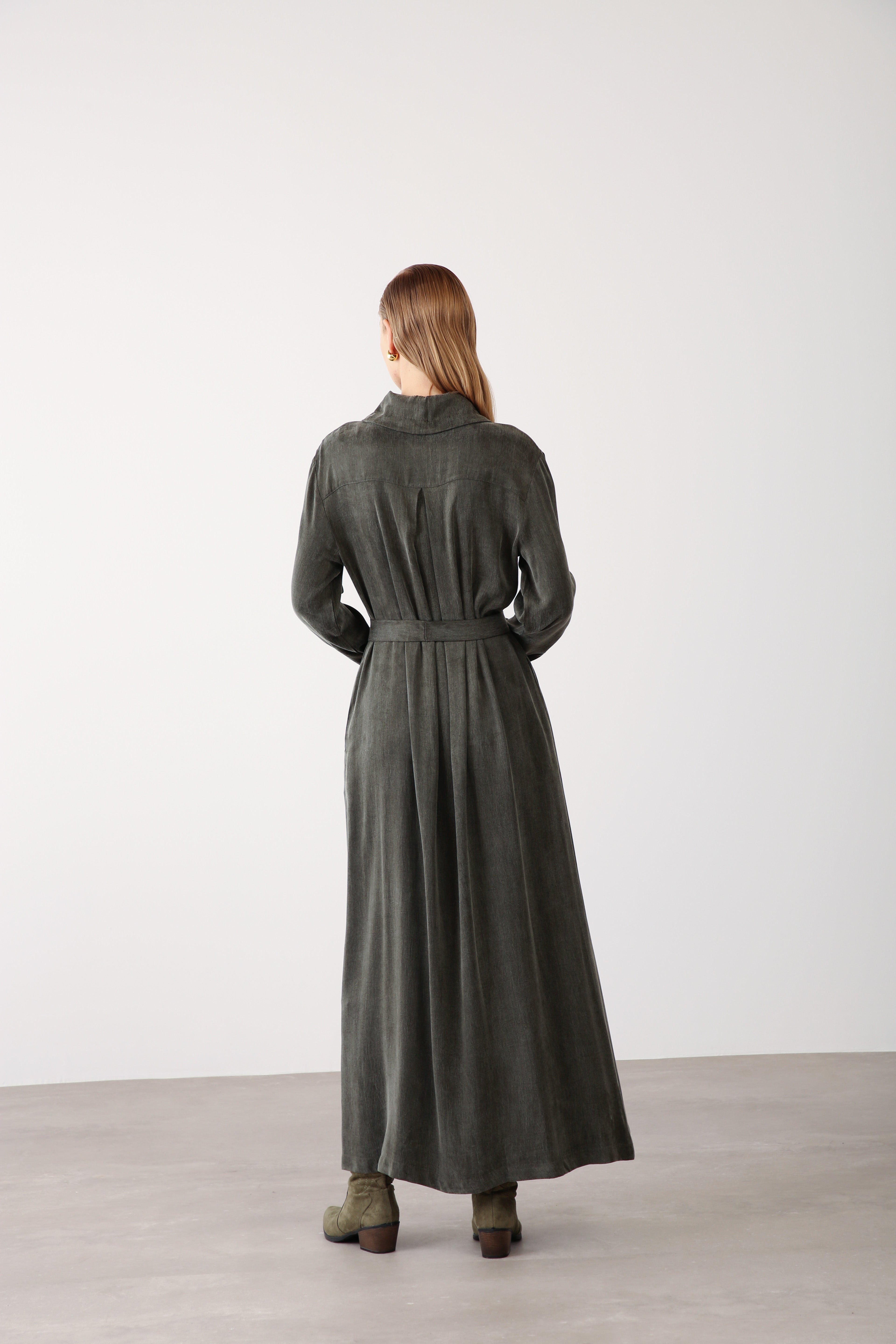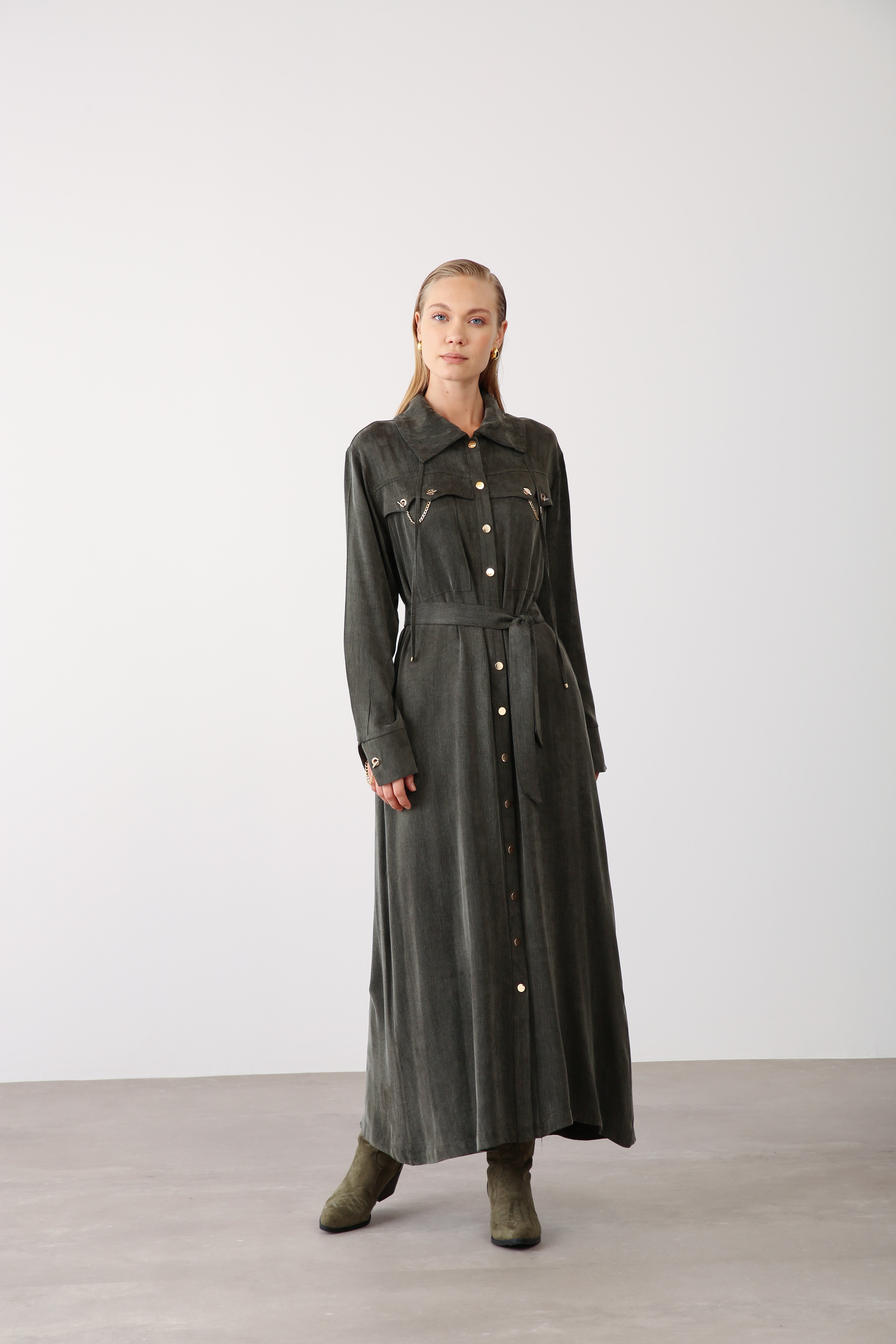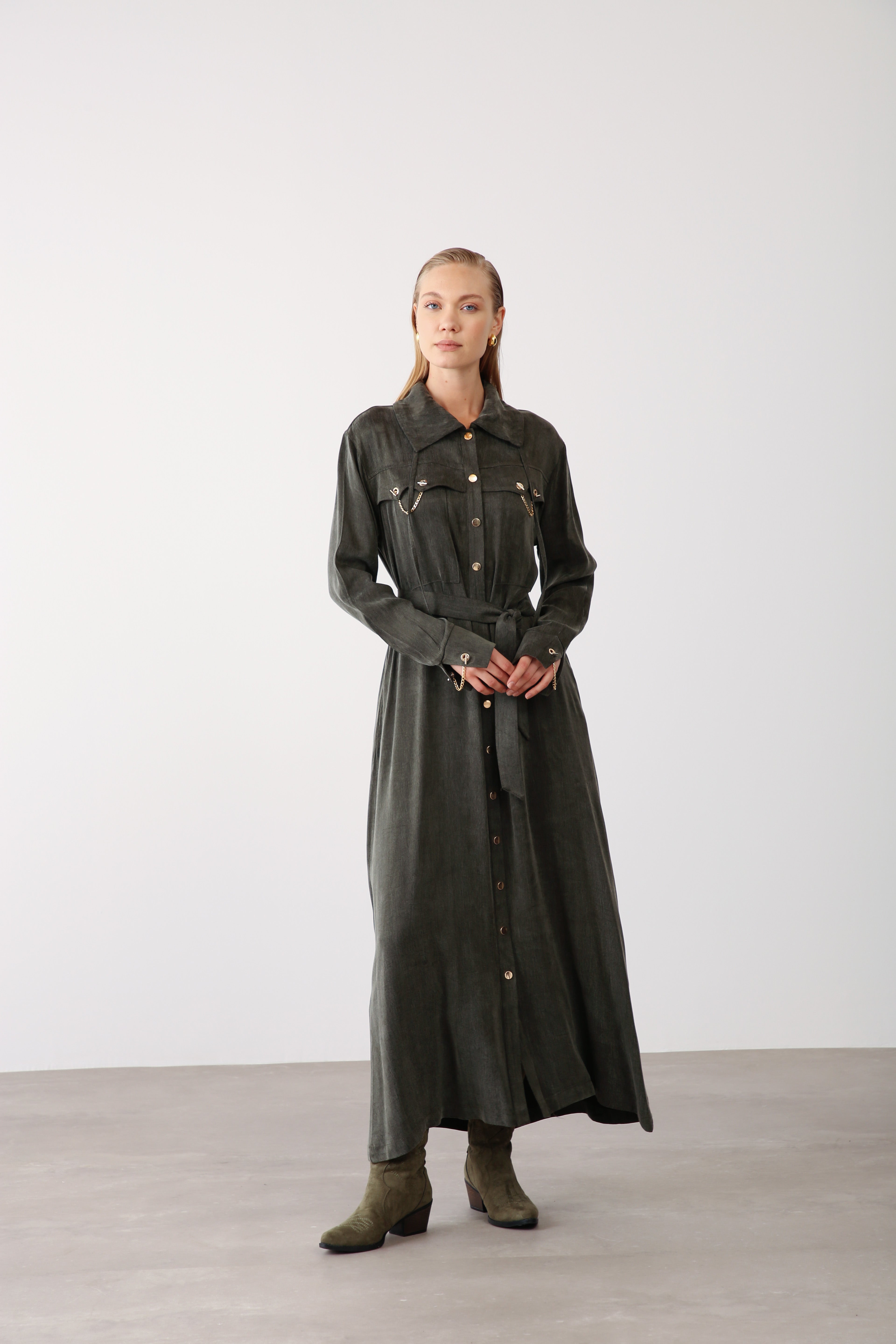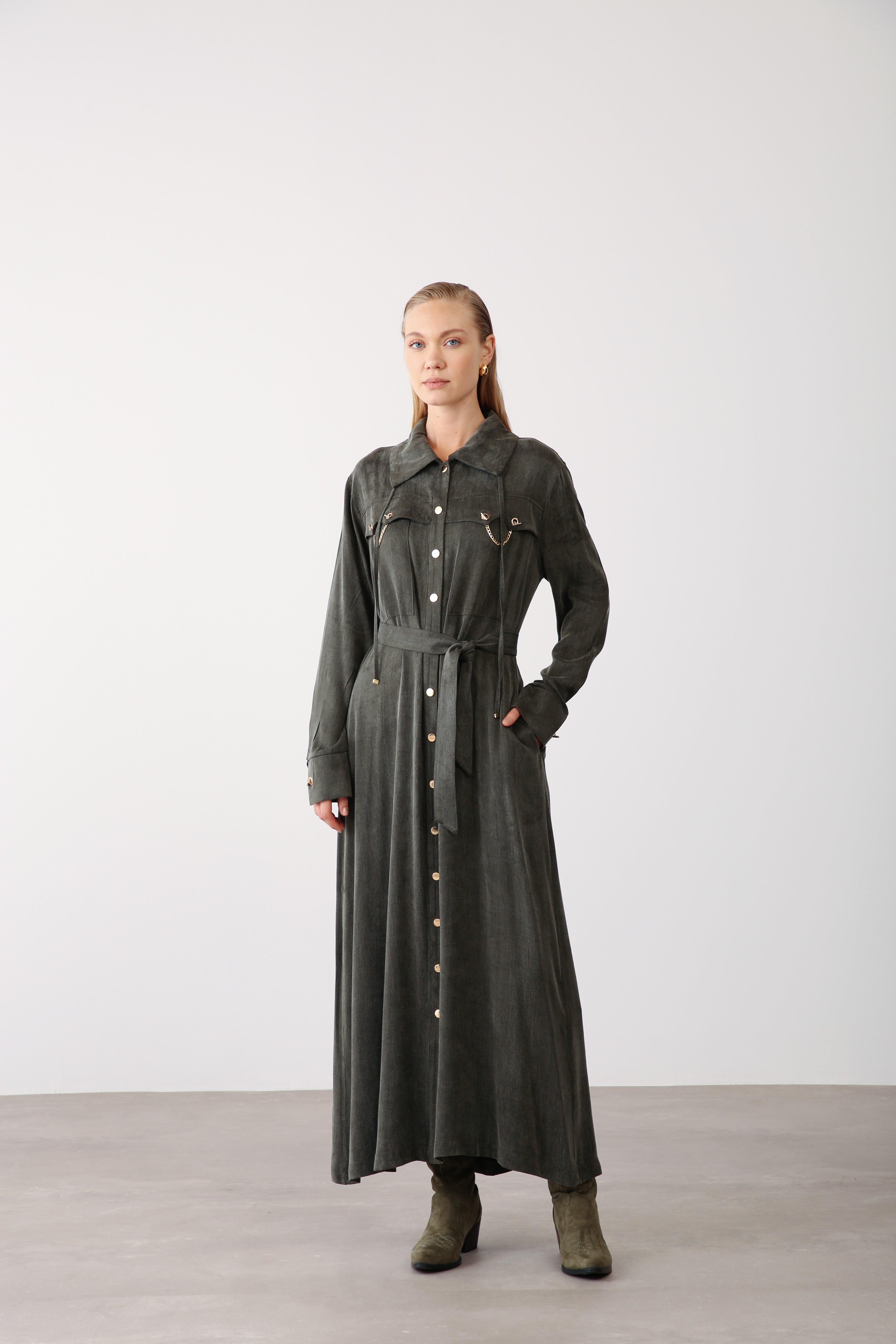 Crafted from premium Cupra fabric, this maxi dress combines durability with a soft drape, ensuring a high-end look that maintains its structure even with frequent wear. The front button closure, statement collar, and removable belt with chain detail provide a refined finish that appeals to a broad range of customers.