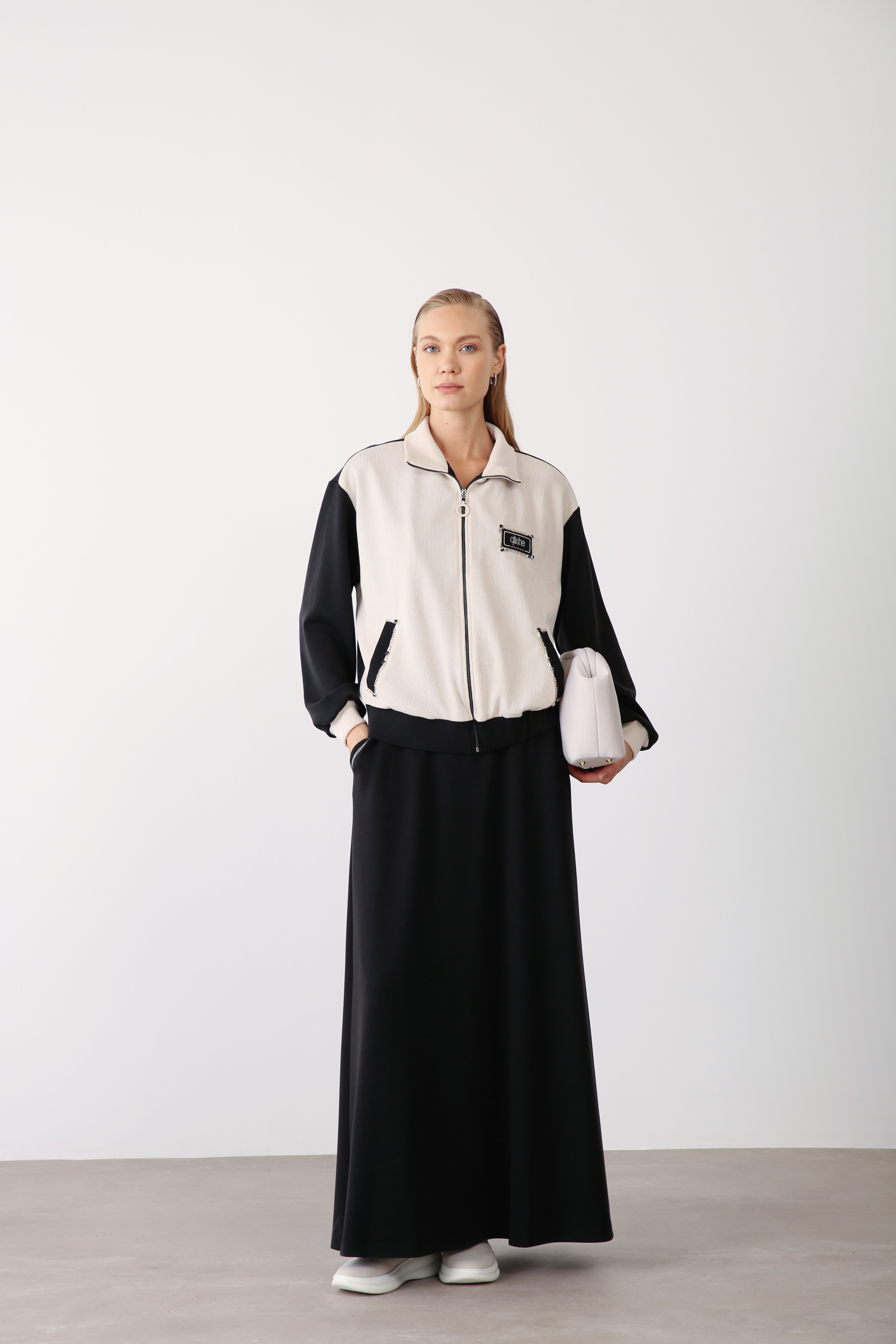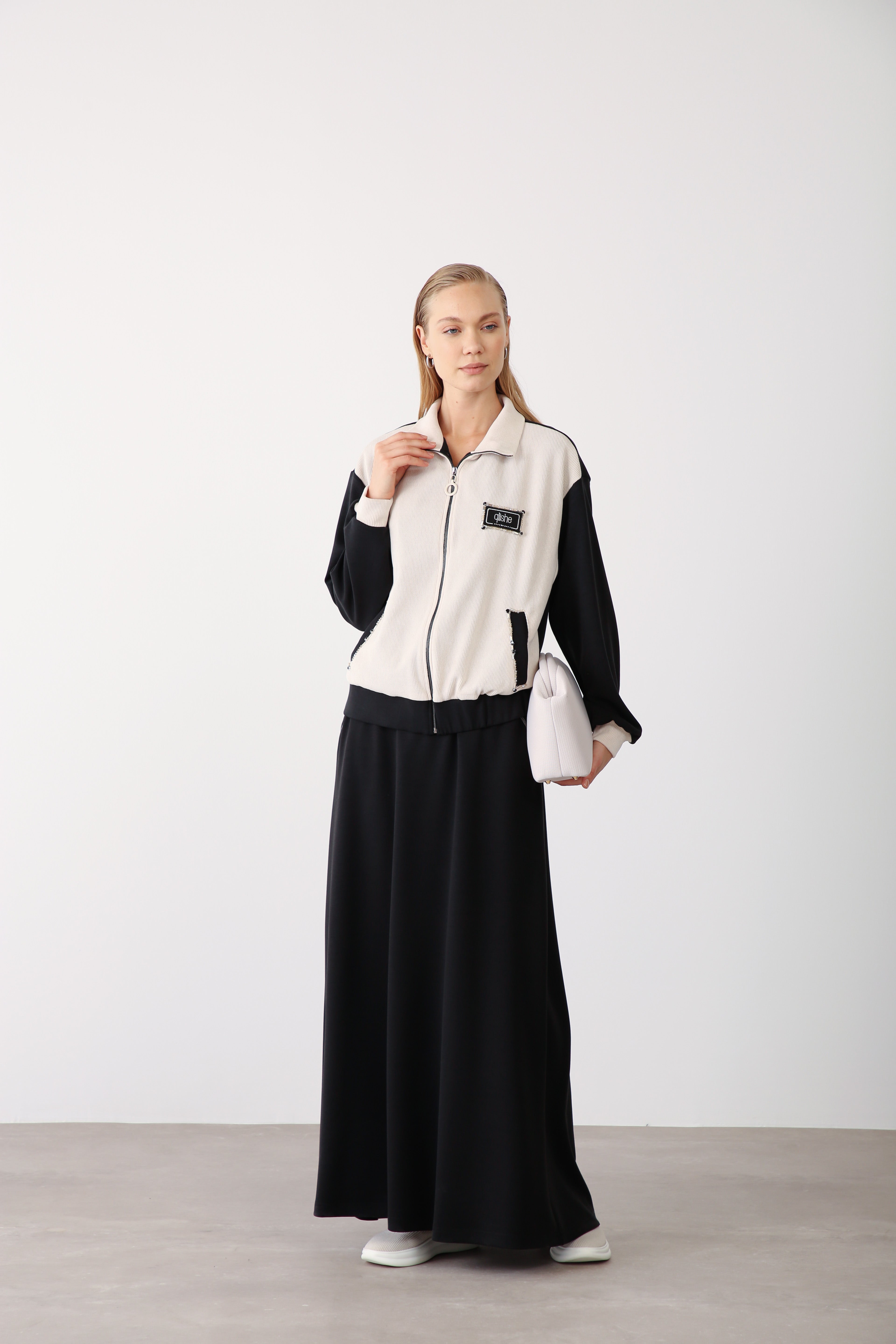 This black long skirt, made from Oysho’s flexible and durable fabric, combines modern comfort with understated sophistication. Its elastic waistband and clean-cut flow offer a flattering fit, while the fabric’s texture gives it a premium finish perfect for boutique displays. A foundational piece for capsule collections that focus on timeless elegance and practicality.