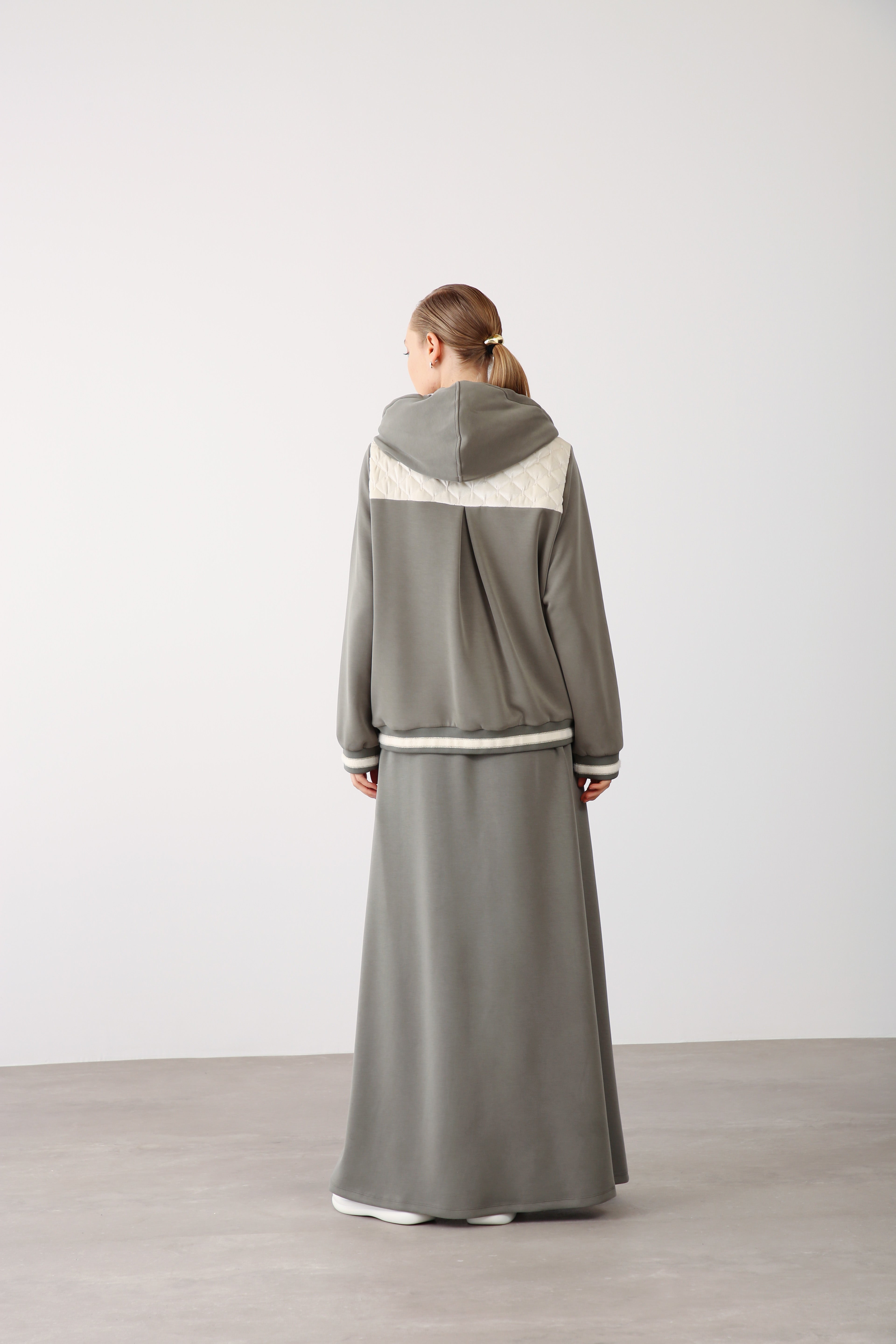 A timeless silhouette crafted from smooth Oysho fabric, this maxi skirt flows elegantly with every movement. Its full-length cut and subtle sheen give it a luxurious drape, while the elastic waistband ensures effortless comfort throughout the day. The minimalist design allows it to pair seamlessly with the matching hoodie jacket or any neutral-toned top.