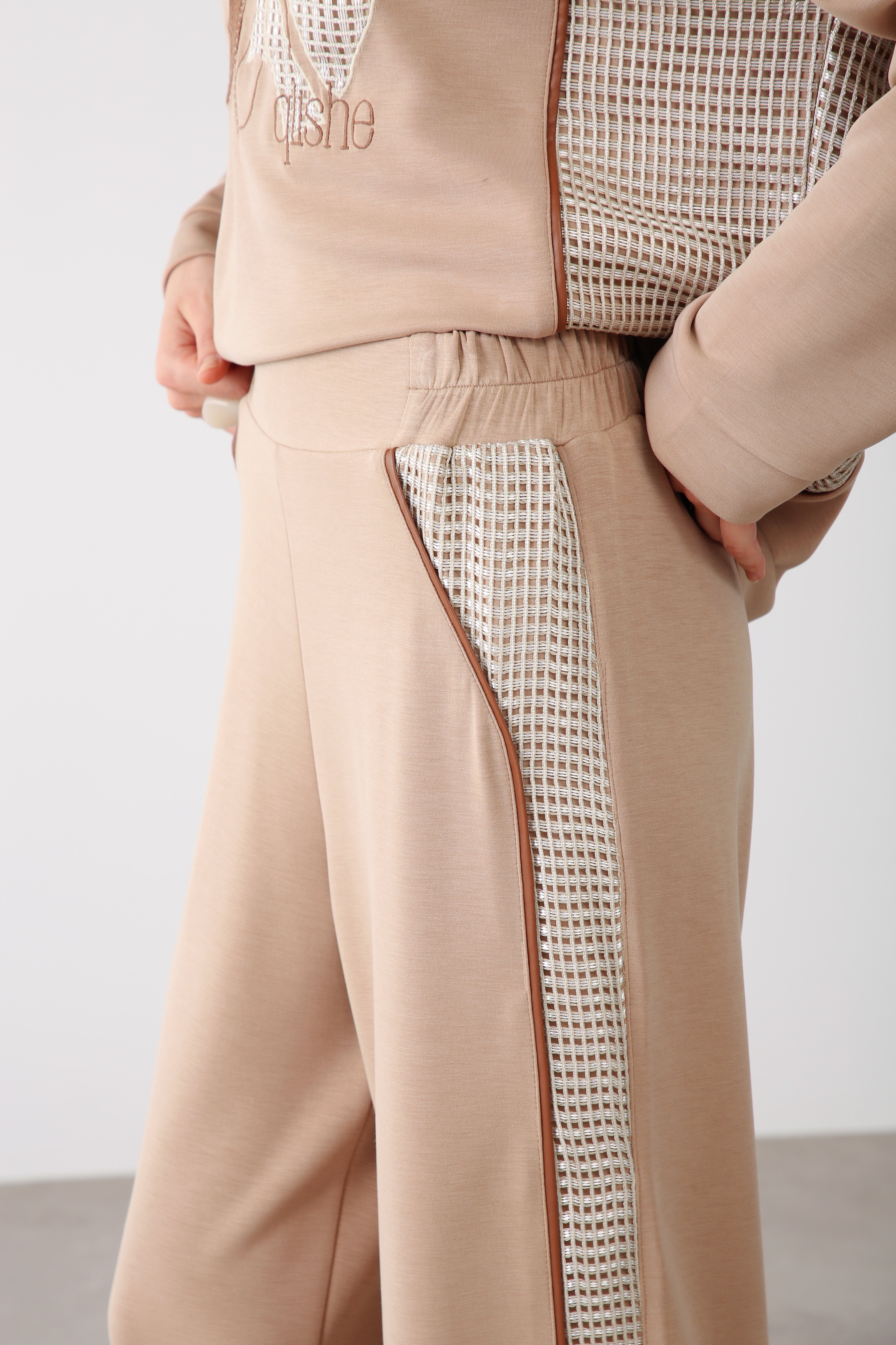 Crafted from soft Oysho fabric, these beige pants combine effortless comfort with a refined design language. The wide-leg silhouette and mesh side panels deliver a sleek, contemporary flow, offering both movement and sophistication. Subtle piping details frame the side inserts, enhancing the visual depth and craftsmanship of the piece.