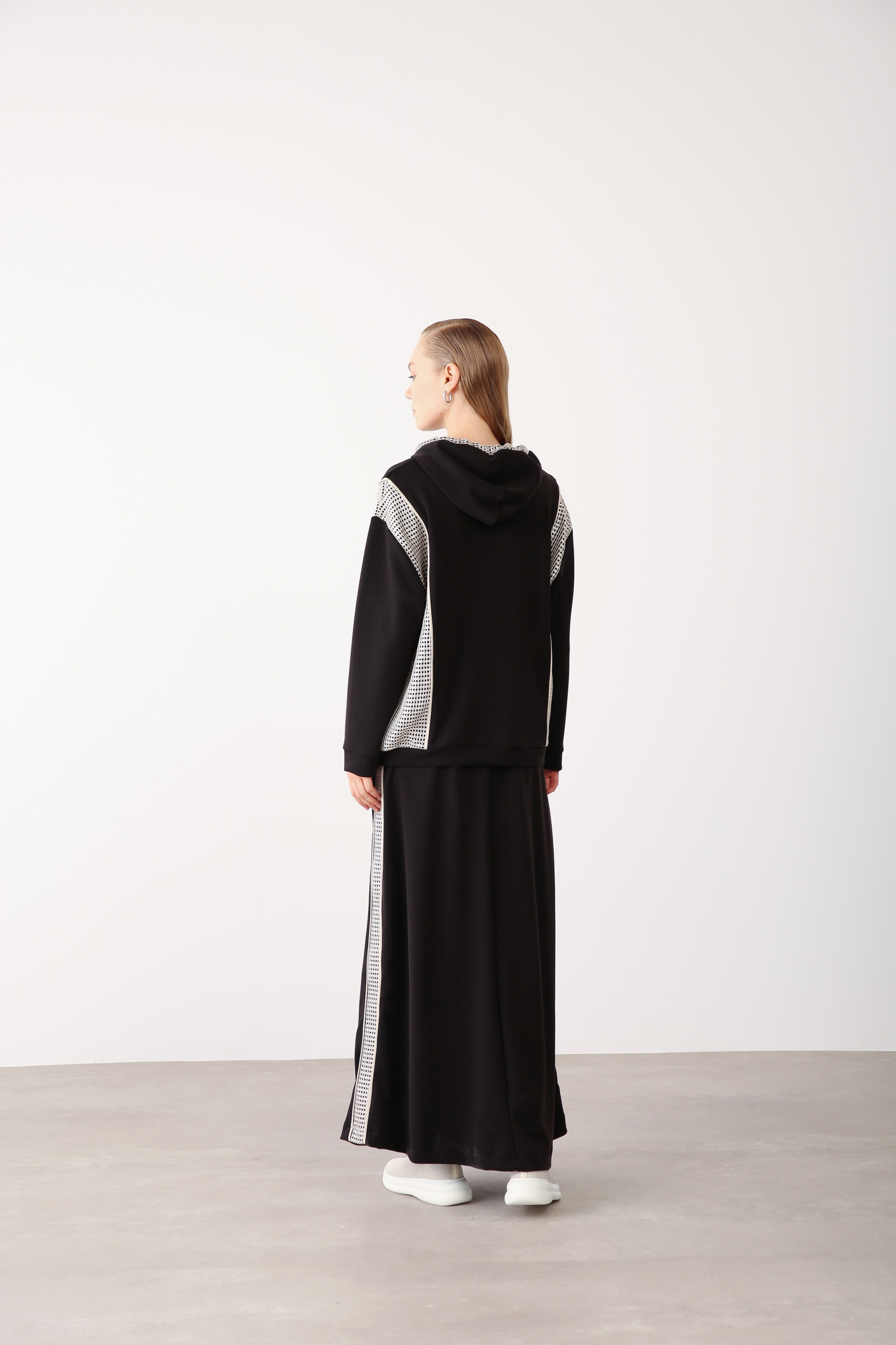 This black mesh-panel skirt is designed for an effortlessly refined silhouette. Made from premium Oysho fabric, it flows gracefully with every step while maintaining its structured elegance. The side mesh inserts add subtle contrast and texture, creating a contemporary look that blends sophistication with comfort.