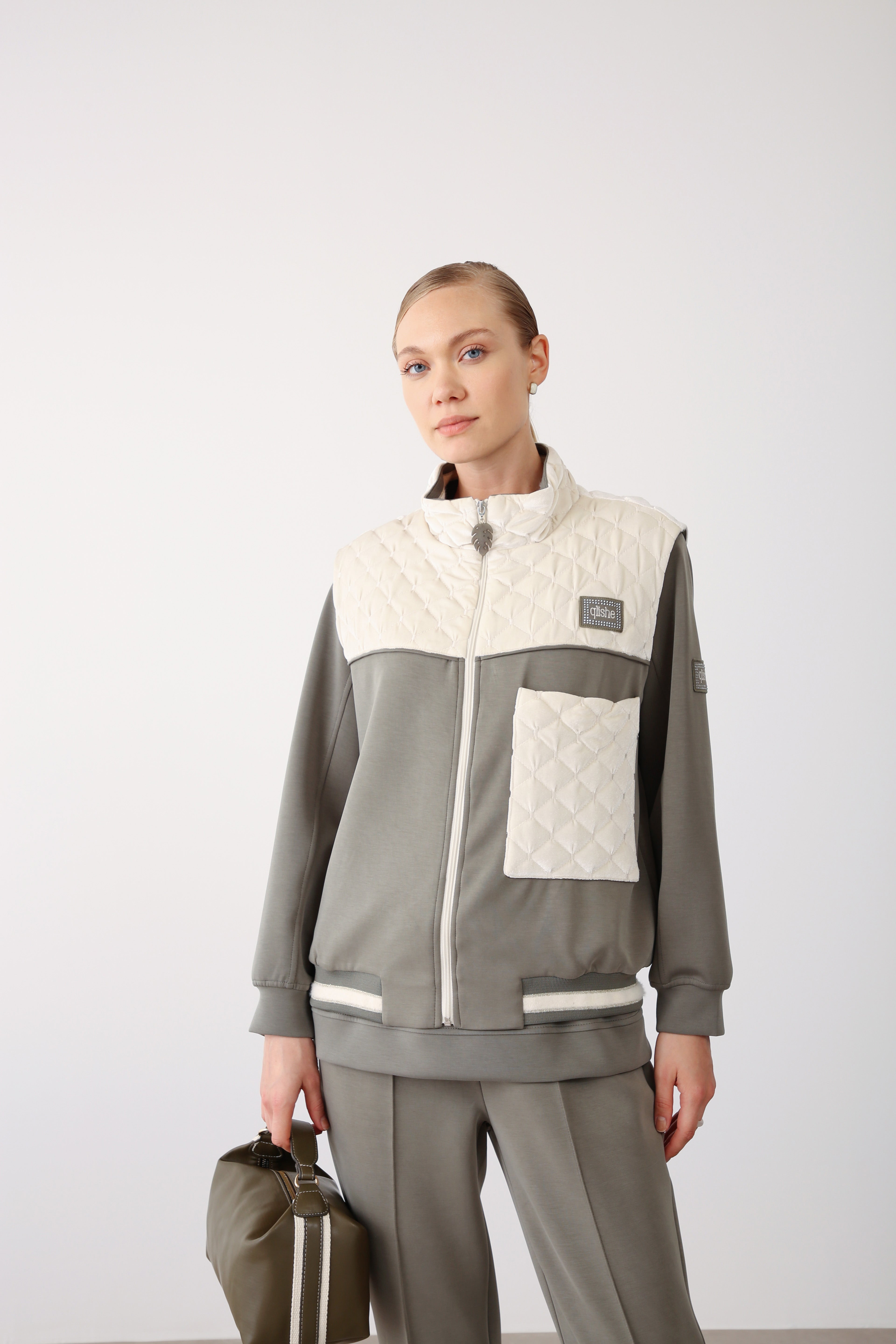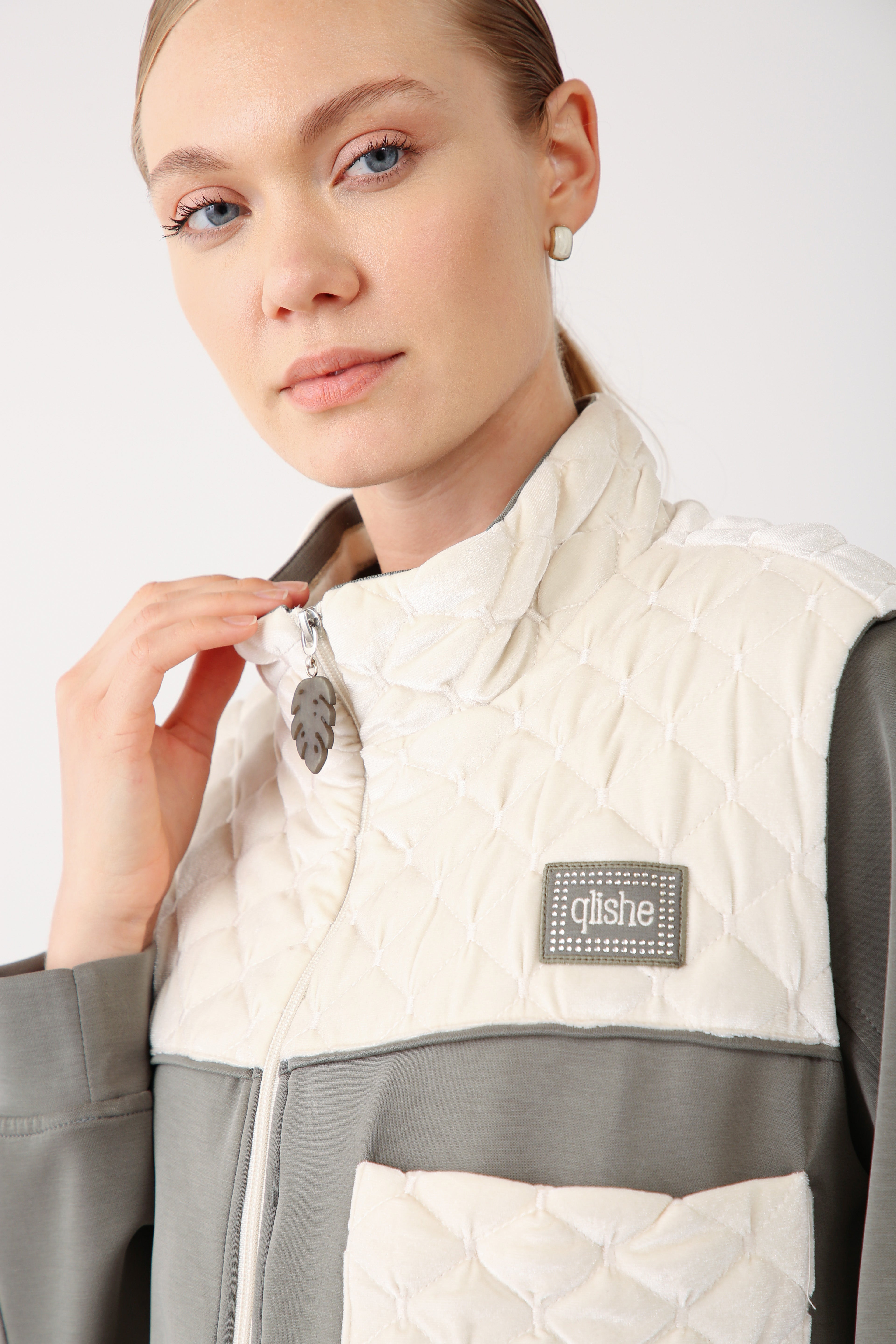 This khaki quilted vest is where texture meets elegance. The diamond-stitched velvet upper blends beautifully with the soft Oysho fabric body, creating a refined yet relaxed look. The high neck offers subtle structure, while the oversized front pocket adds a touch of urban practicality.