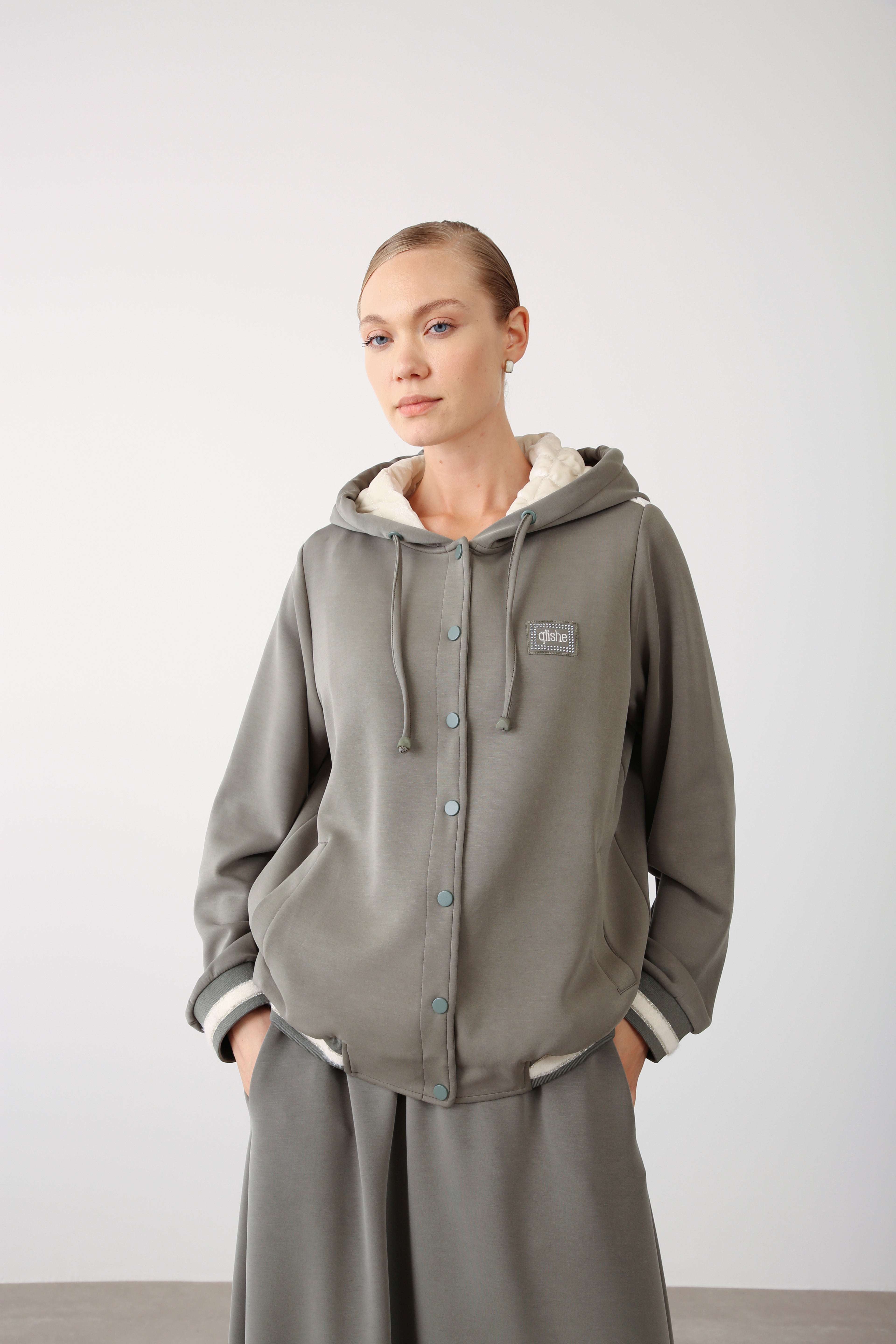 Crafted with refined simplicity, this khaki hoodie jacket combines the smooth texture of Oysho fabric with the plush warmth of quilted velvet lining. The ribbed cuffs and hem offer a soft contrast, while the hood’s structured form adds volume and coziness. Matte snap buttons and a crystal-detailed Qlishe logo accentuate its minimalist yet elevated appeal.