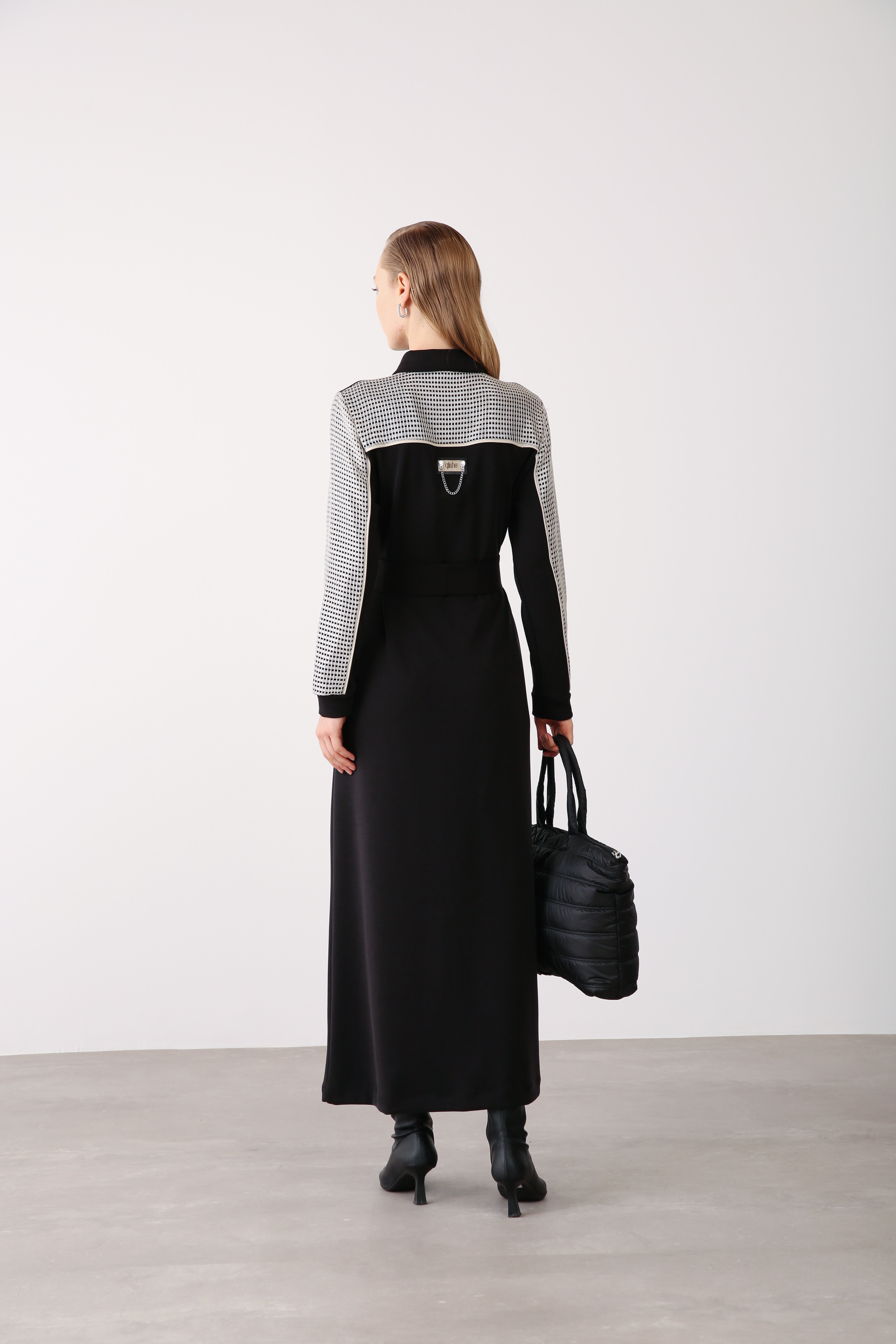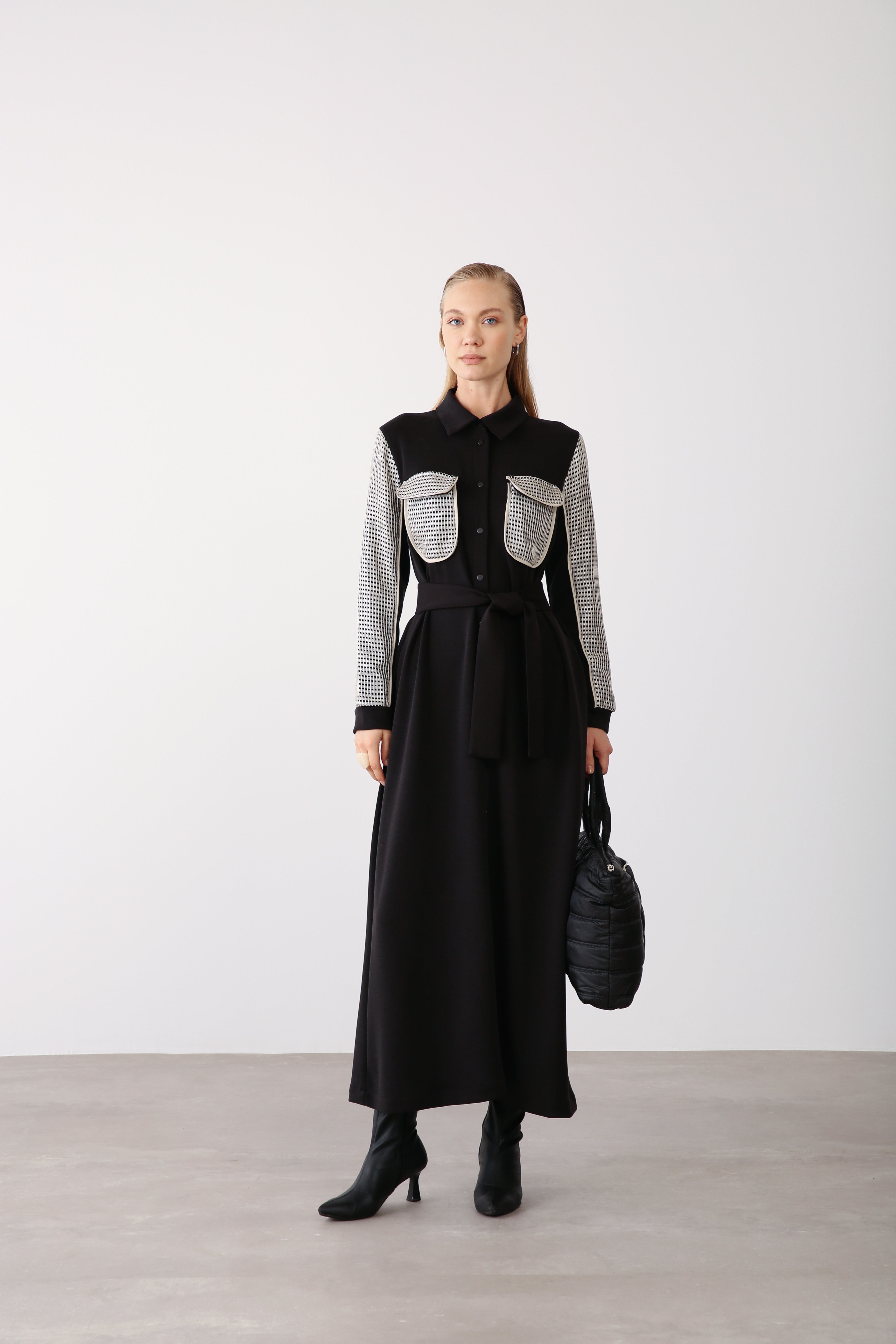 This black long dress embodies refined sophistication with a contemporary edge. Crafted from premium Oysho fabric, it features elegant mesh inserts on the sleeves and pockets, enhanced by subtle leather piping. The belted waist creates a flattering silhouette, while the full-length button closure allows flexibility in styling perfect for both professional and casual ensembles.