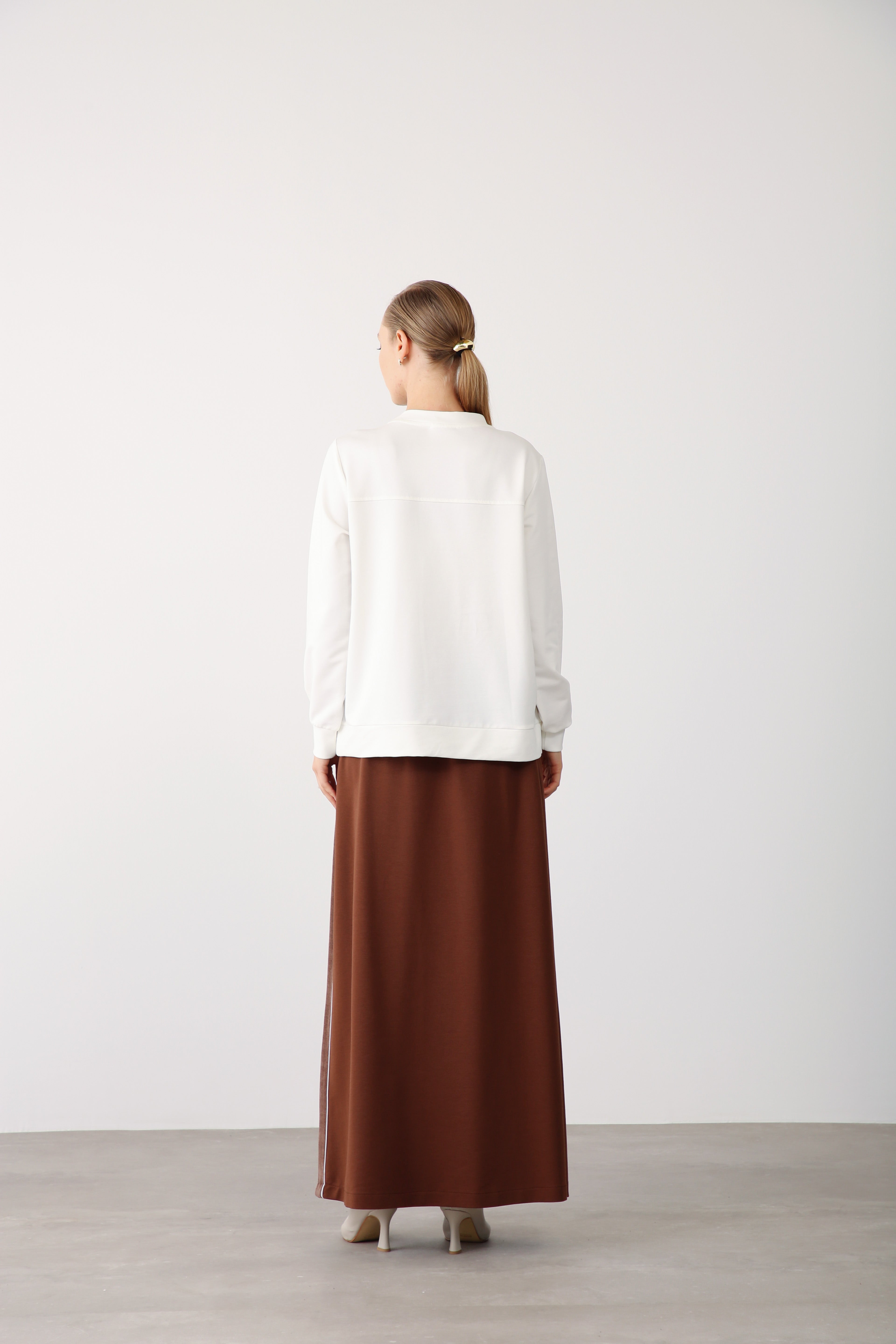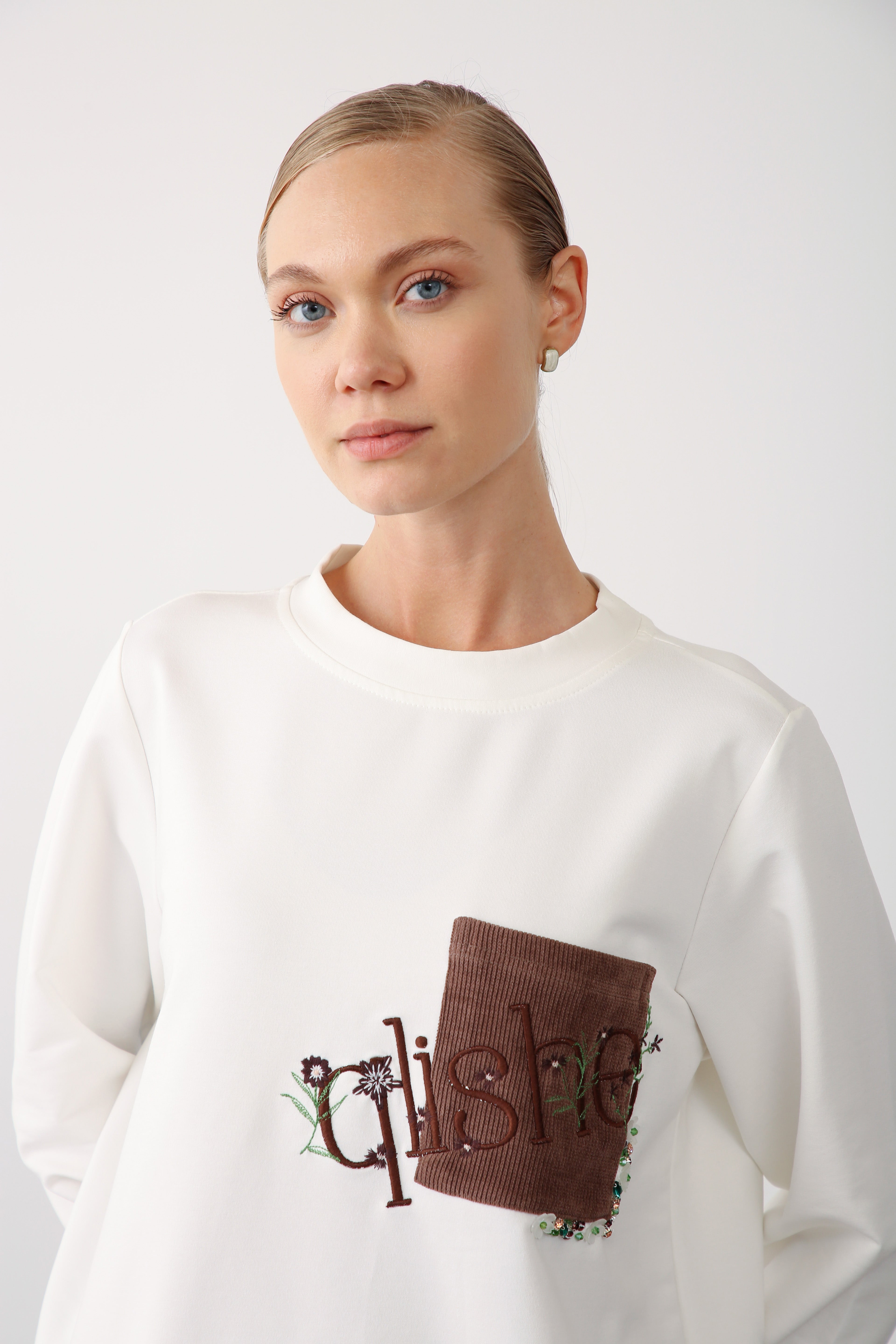 This brown sweatshirt, crafted from Premium Combed Cotton fabric, combines casual comfort with refined artistry. Featuring a front embroidered detail and a soft ribbed neckline, it offers a relaxed yet elevated silhouette ideal for modern women’s everyday wear. The corduroy chest accent with delicate beadwork adds texture and character, transforming a simple sweatshirt into a statement piece.