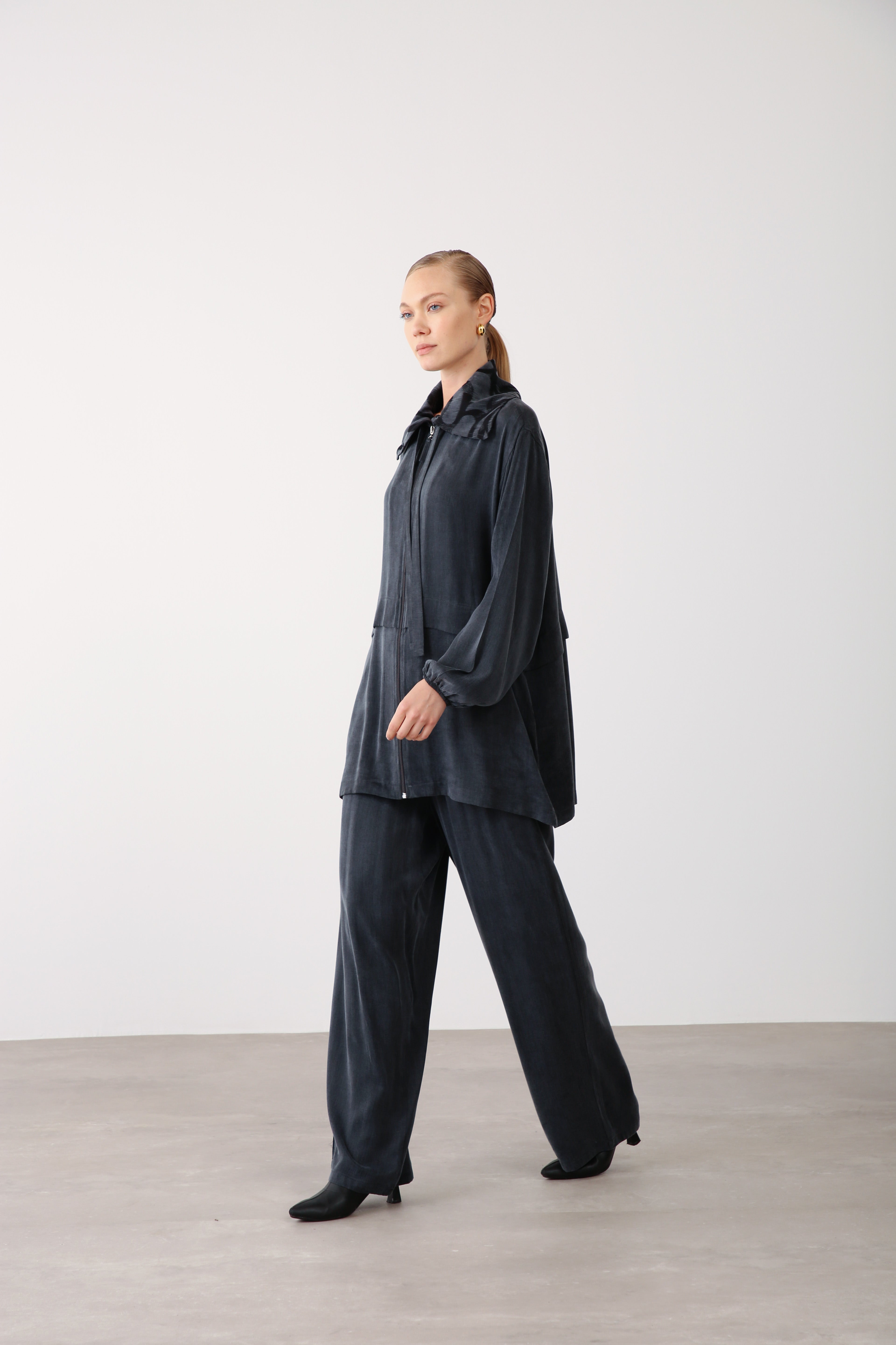 These black wide-leg pants are crafted from smooth Cupra fabric, known for its soft texture and subtle sheen. Designed with an elastic waistband and hidden side pockets, they offer effortless comfort and elevated style for versatile retail assortments. The relaxed cut ensures a flattering drape suitable for all-day wear.