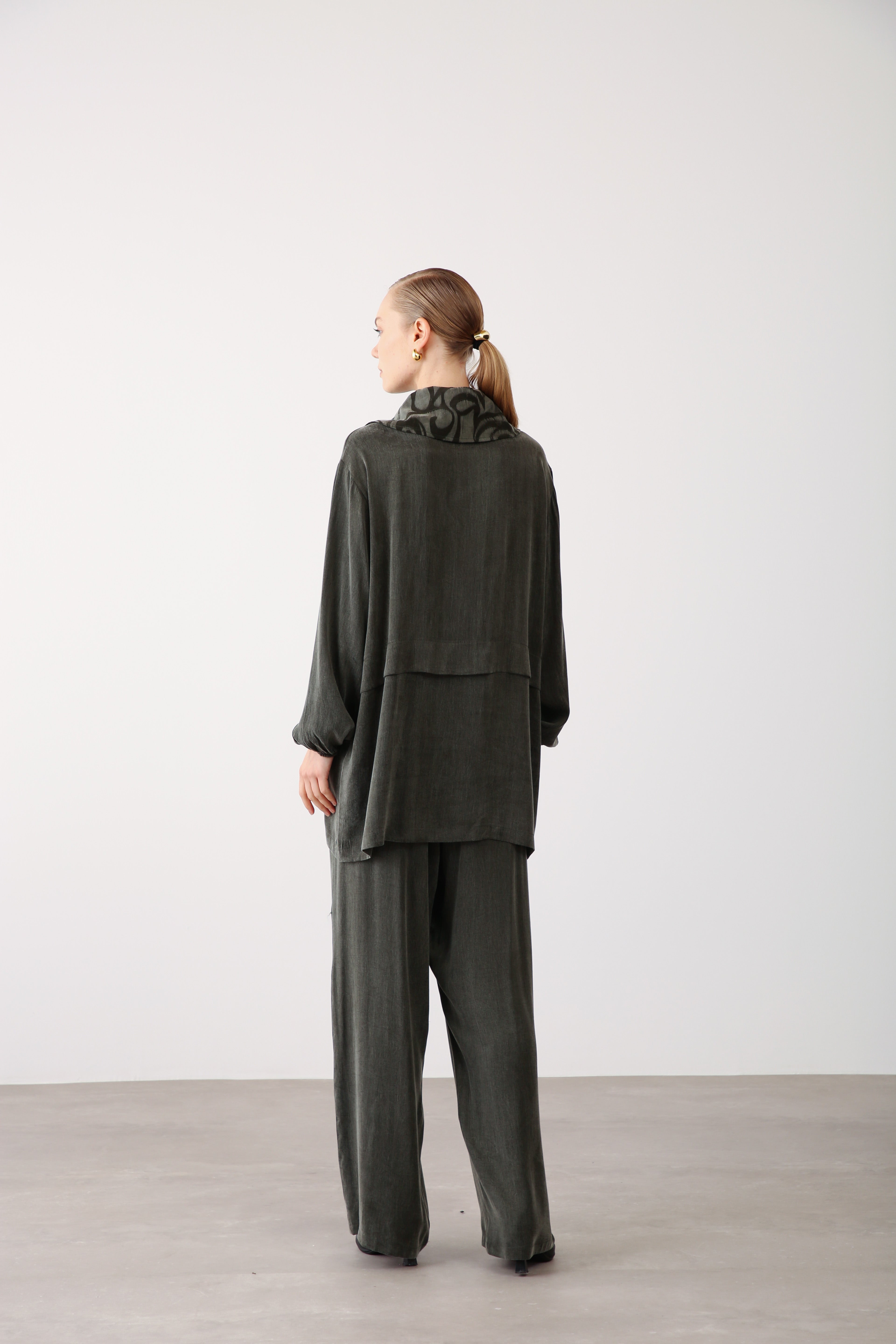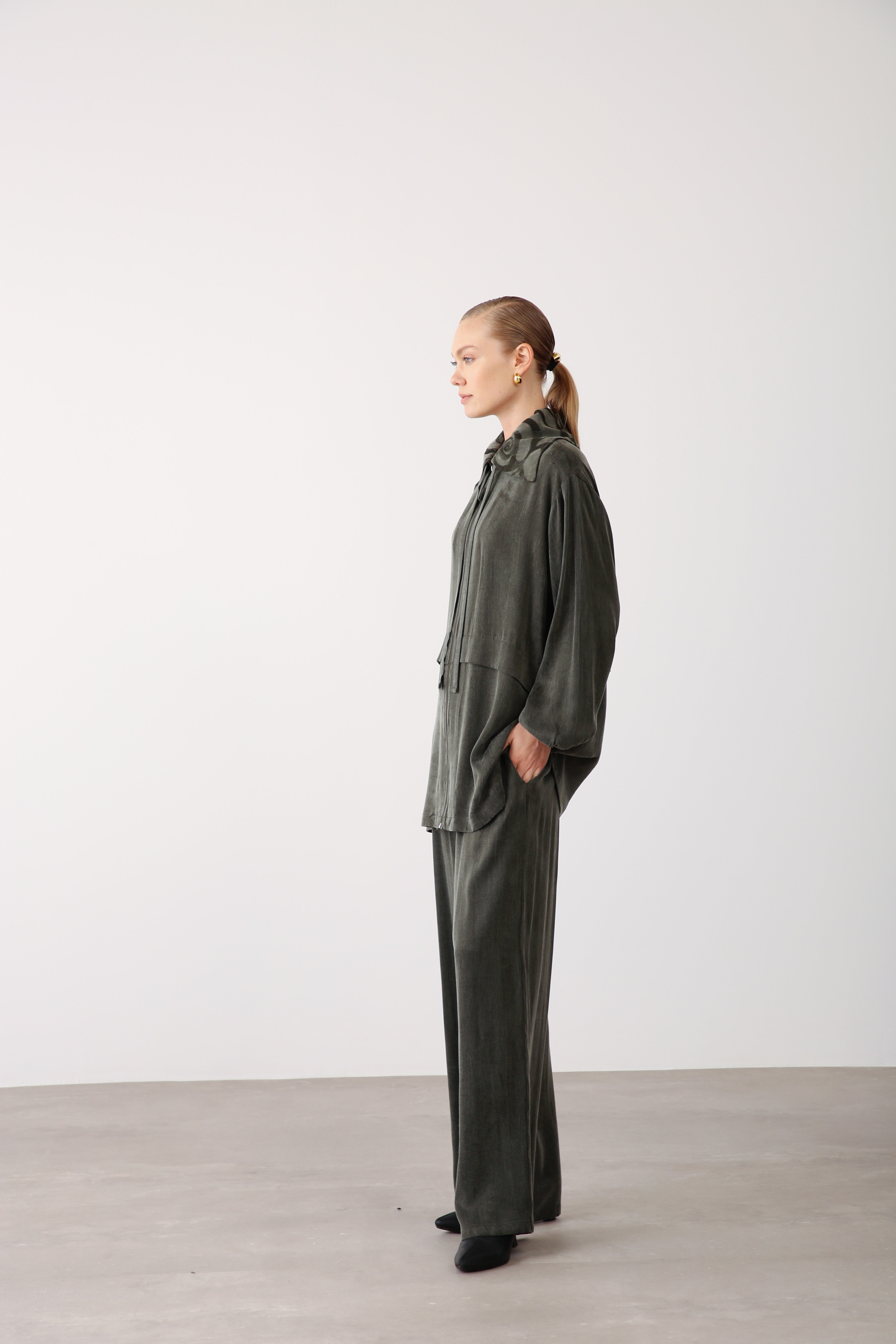 Made from soft, breathable Cupra fabric, these khaki pants offer a relaxed fit with wide legs and an elastic waistband. The smooth matte surface provides a sophisticated look suitable for both casual and smart assortments. Featuring hidden side pockets, it combines practicality with elevated design.
