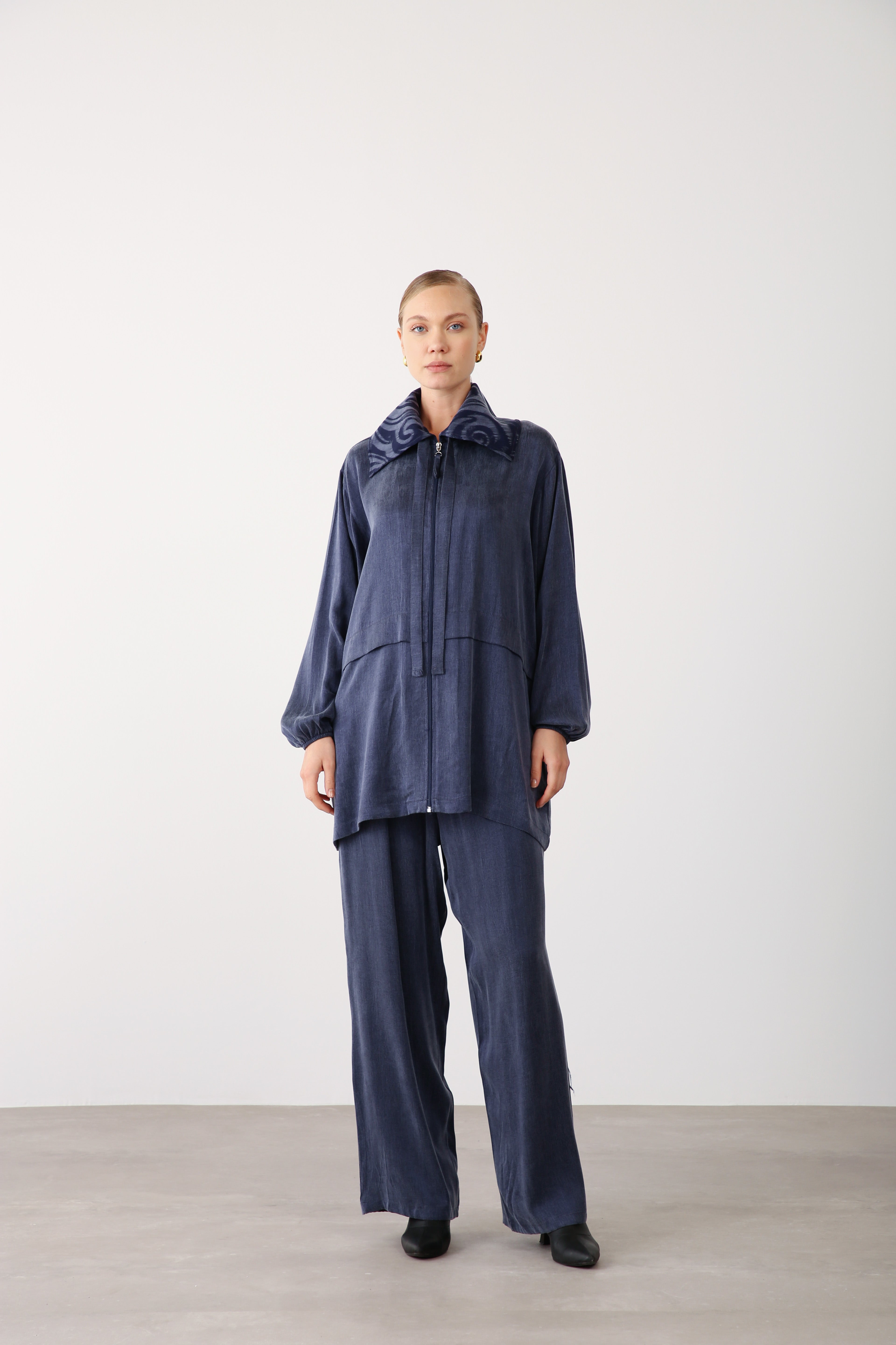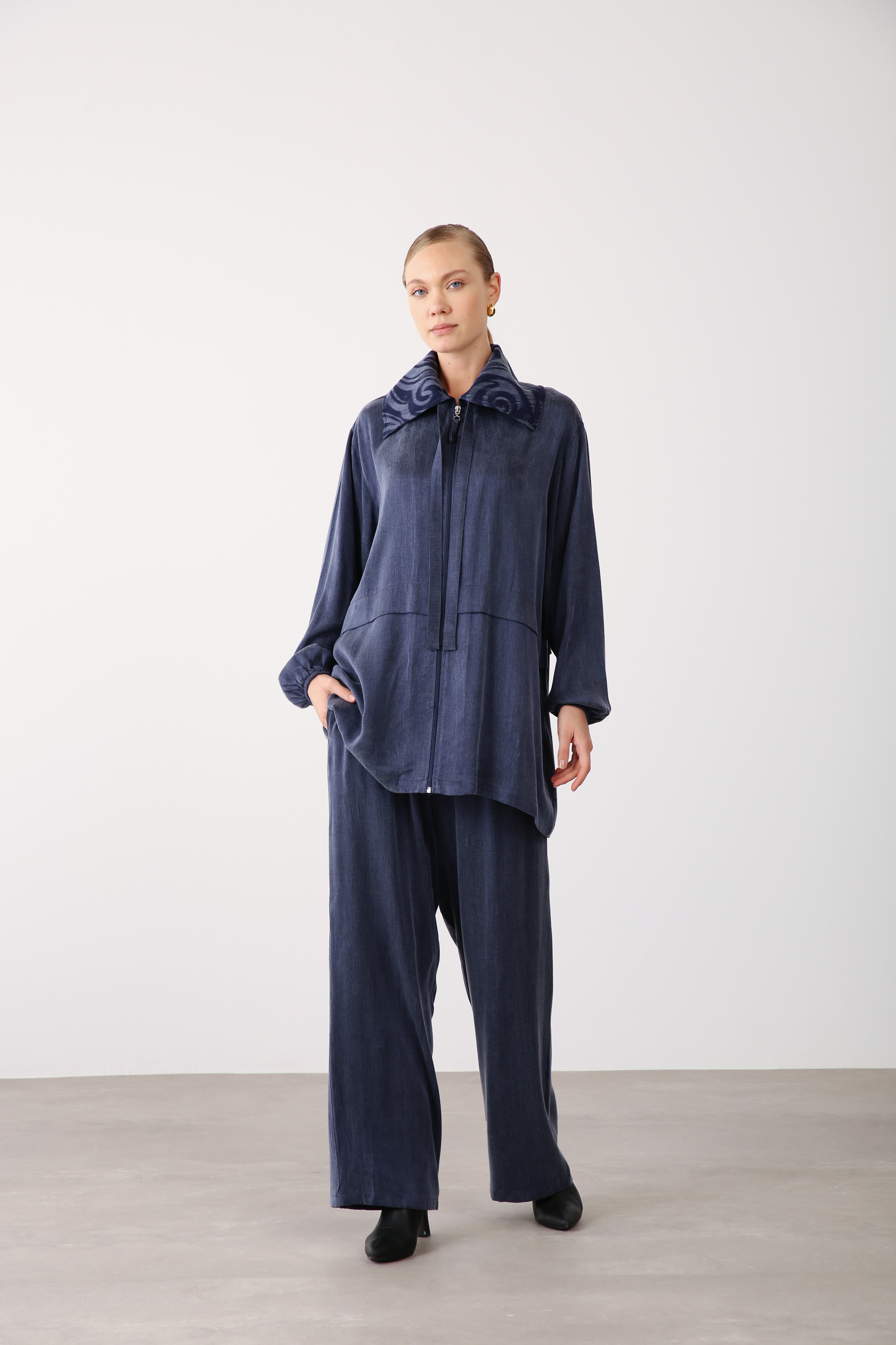 Tailored from refined navy Cupra fabric, these pants deliver a balance of structure and fluidity. The elastic waistband ensures adaptability, while the matte finish adds a touch of understated luxury. Ideal for multi-season retail assortments, they maintain shape and comfort even after extended wear.
