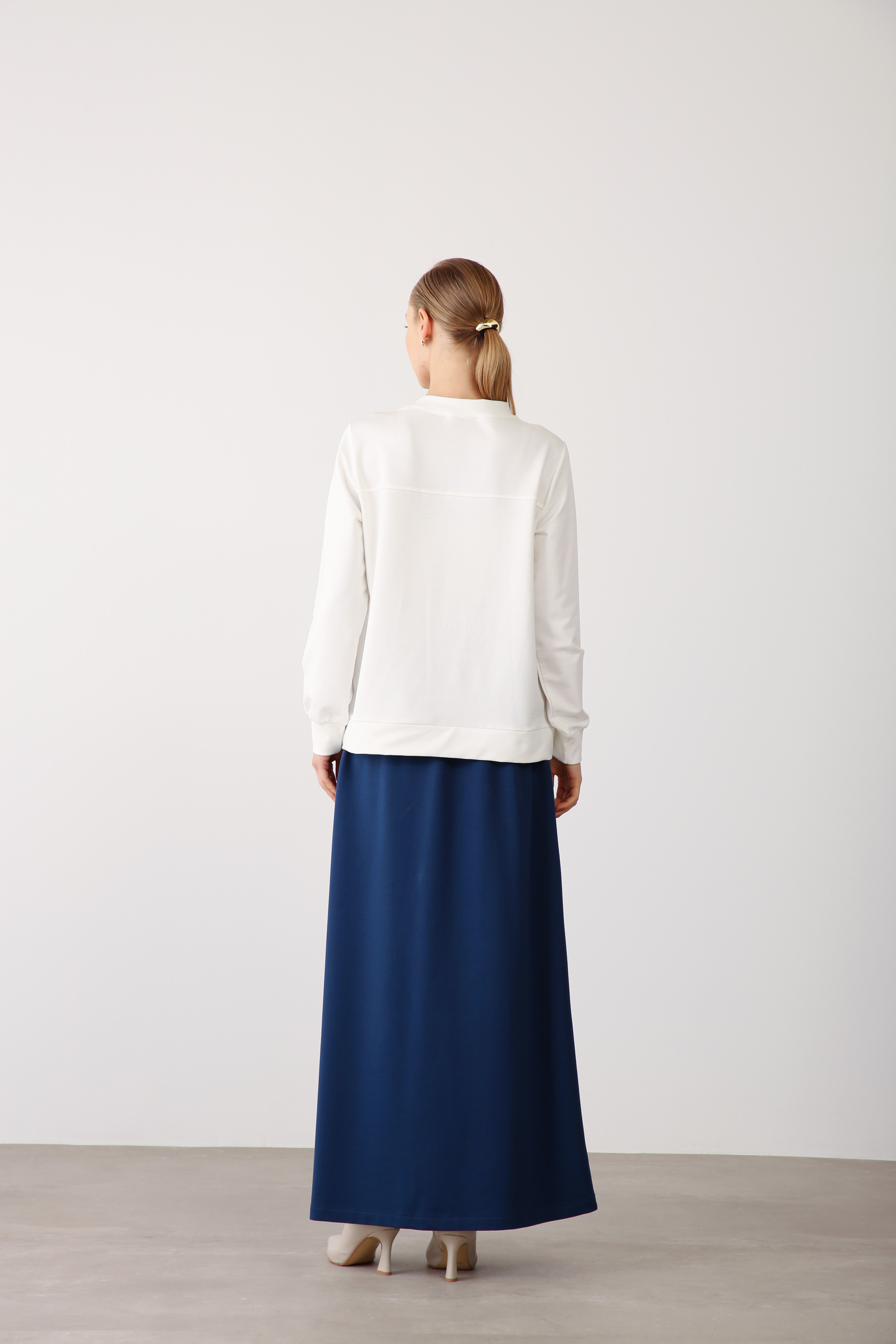 Its deep indigo tone adds modern freshness while maintaining a timeless appeal. The high-quality finish and delicate detailing make this sweatshirt a versatile piece for women seeking elegance in simplicity—an excellent addition to premium wholesale assortments.