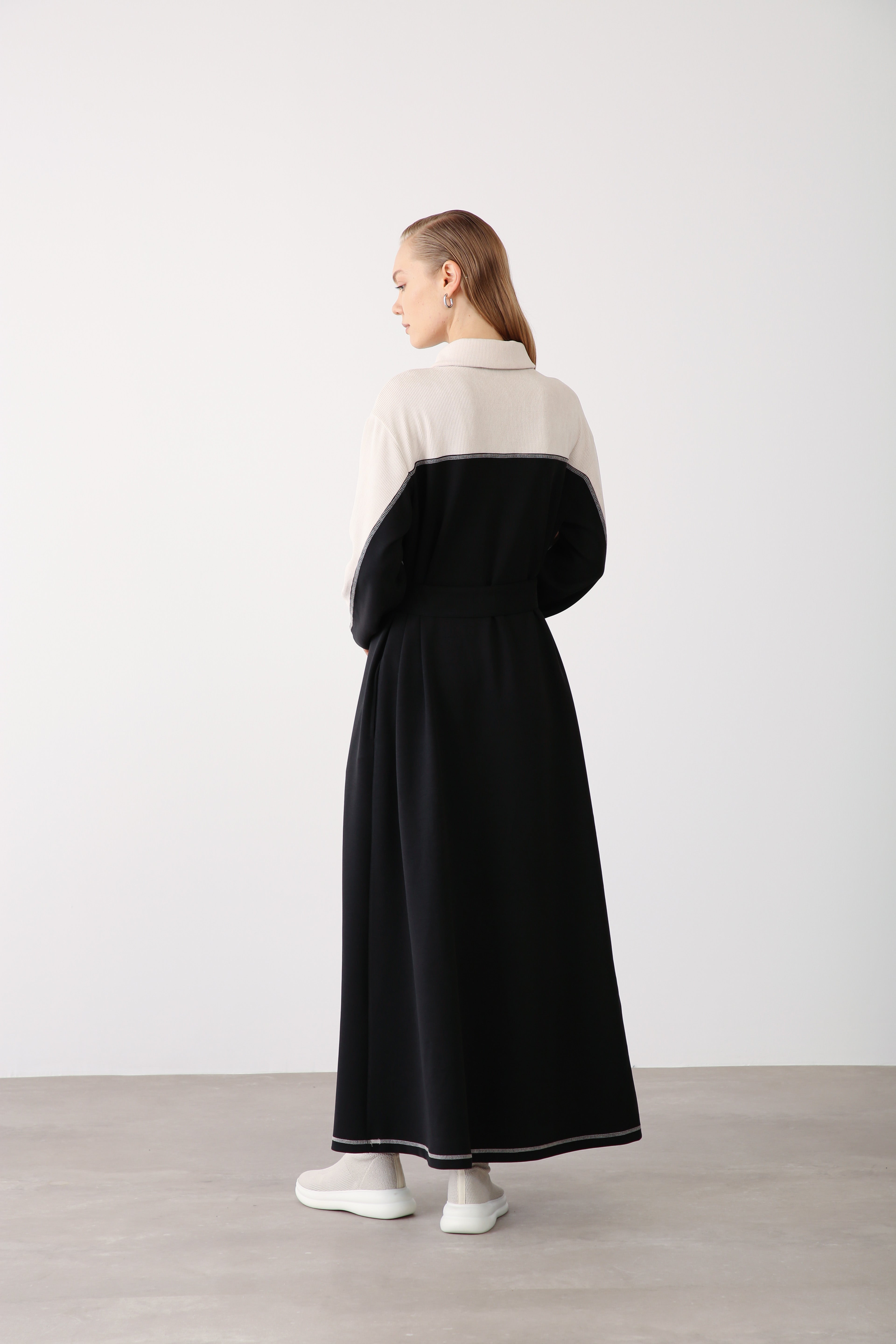 This Black Premium Cotton Midi Dress defines quiet elegance with a contemporary spirit. Designed in soft, mid-weight Premium Cotton, it features a subtle contrast in texture around the shoulders and sleeves, adding a touch of dimension to its clean lines. The belted waist creates a feminine, elongated silhouette that flows gracefully with every step.