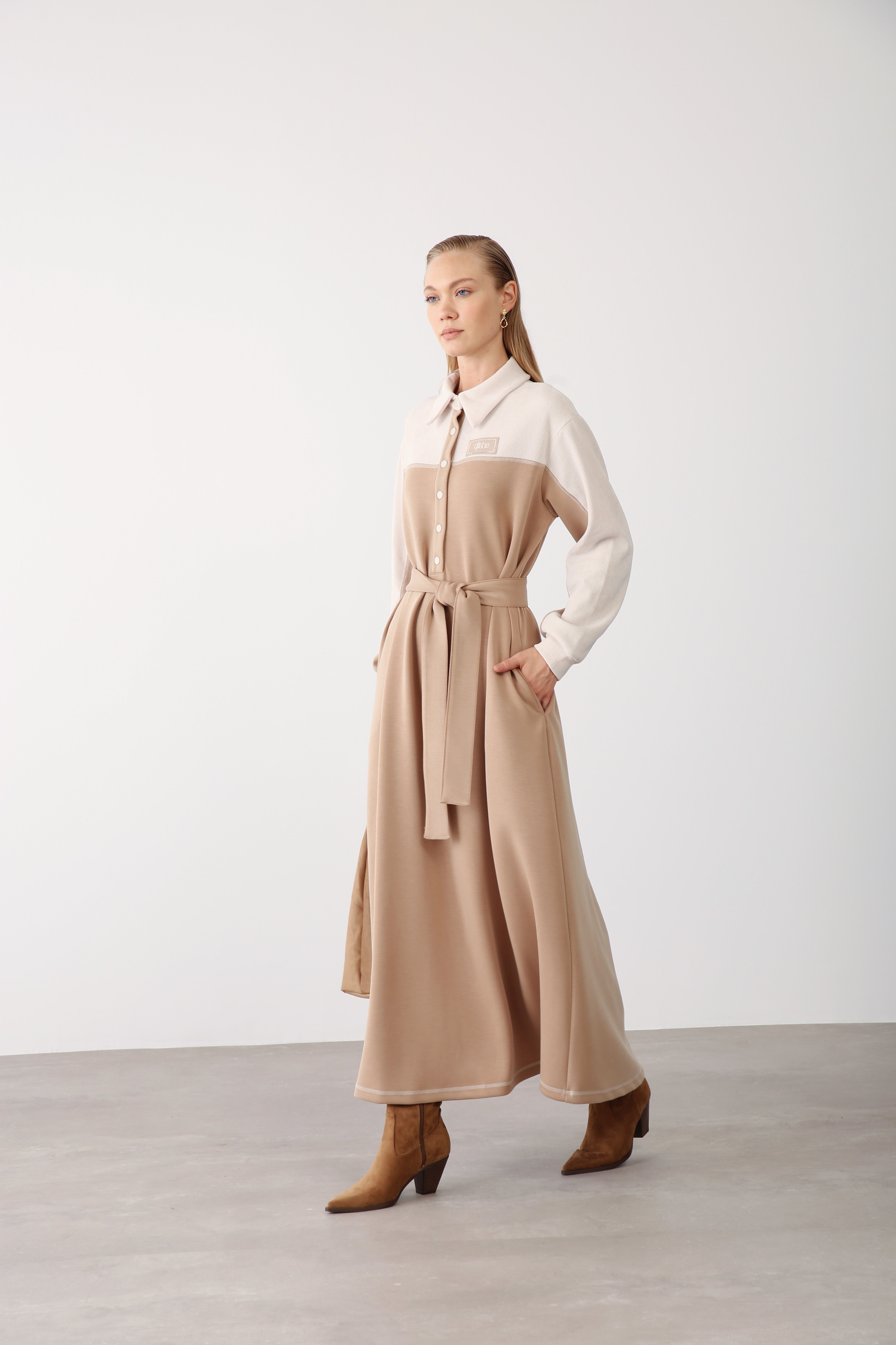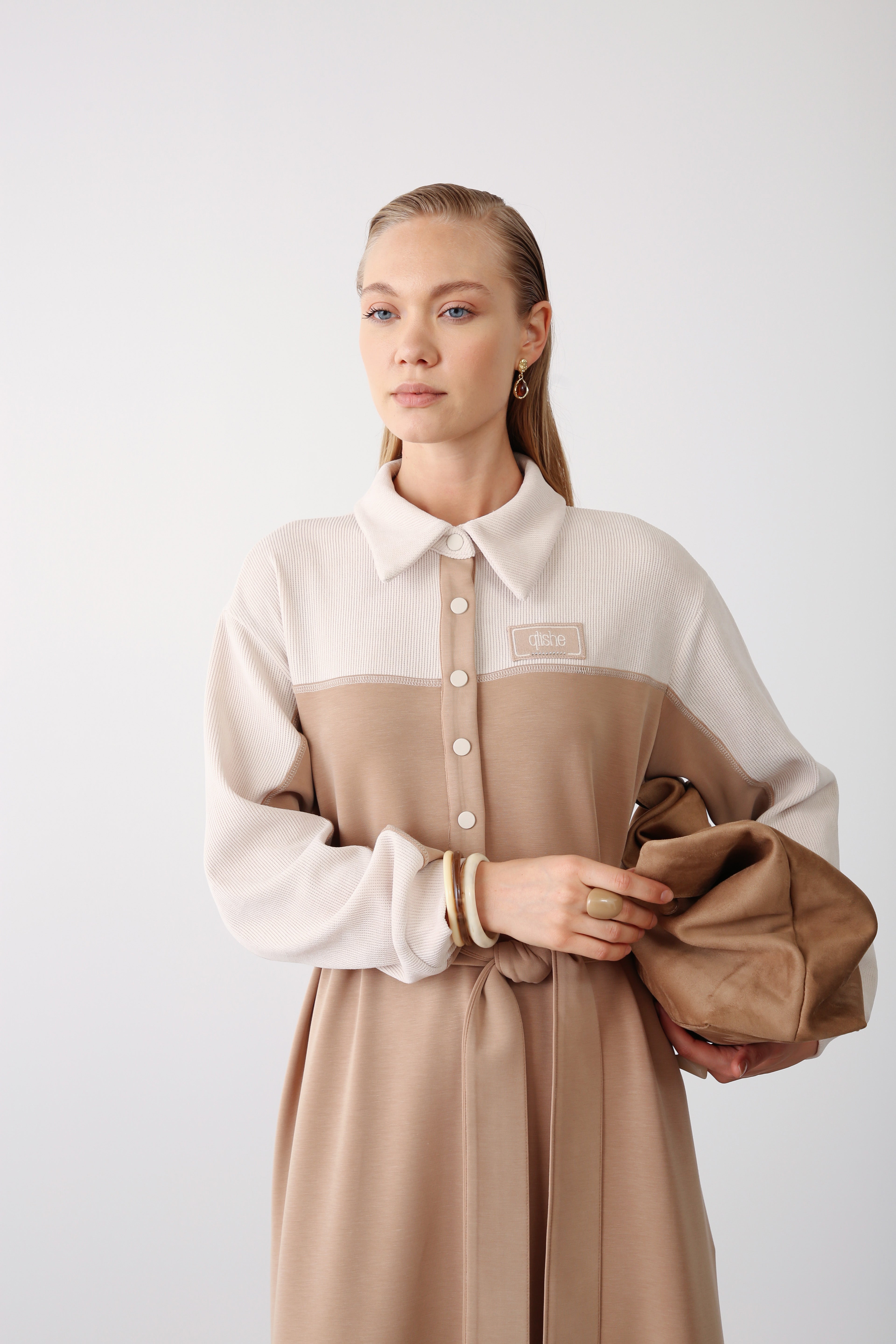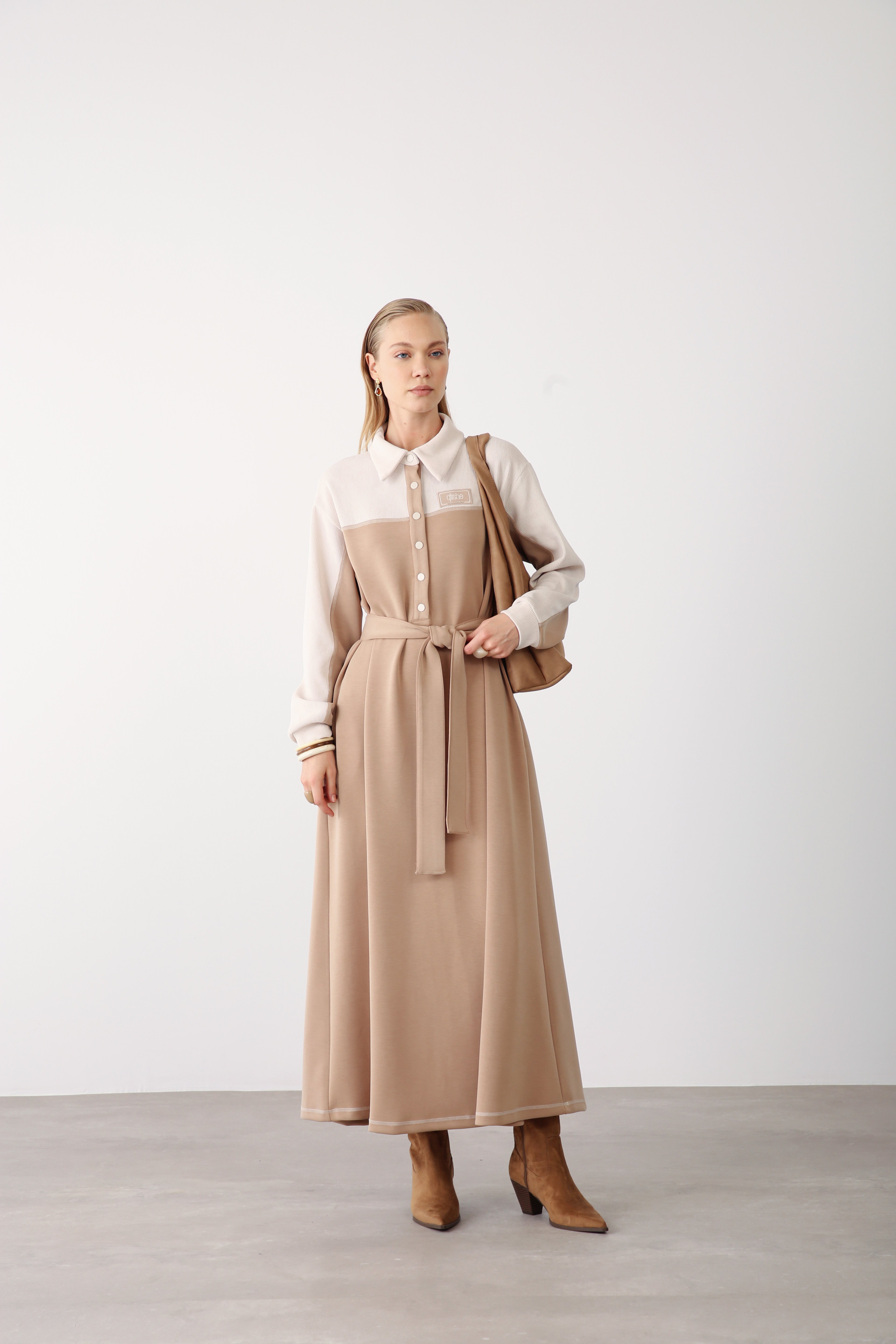 This Camel premium cotton dress blends minimalist lines with soft, feminine charm. Crafted from premium mid-weight Premium Cotton fabric, it features a subtle contrast texture at the shoulders and sleeves, adding a refined dimensional look. The front snap-button closure and adjustable waist belt define the silhouette gracefully, while the midi length ensures an elegant flow with every movement.