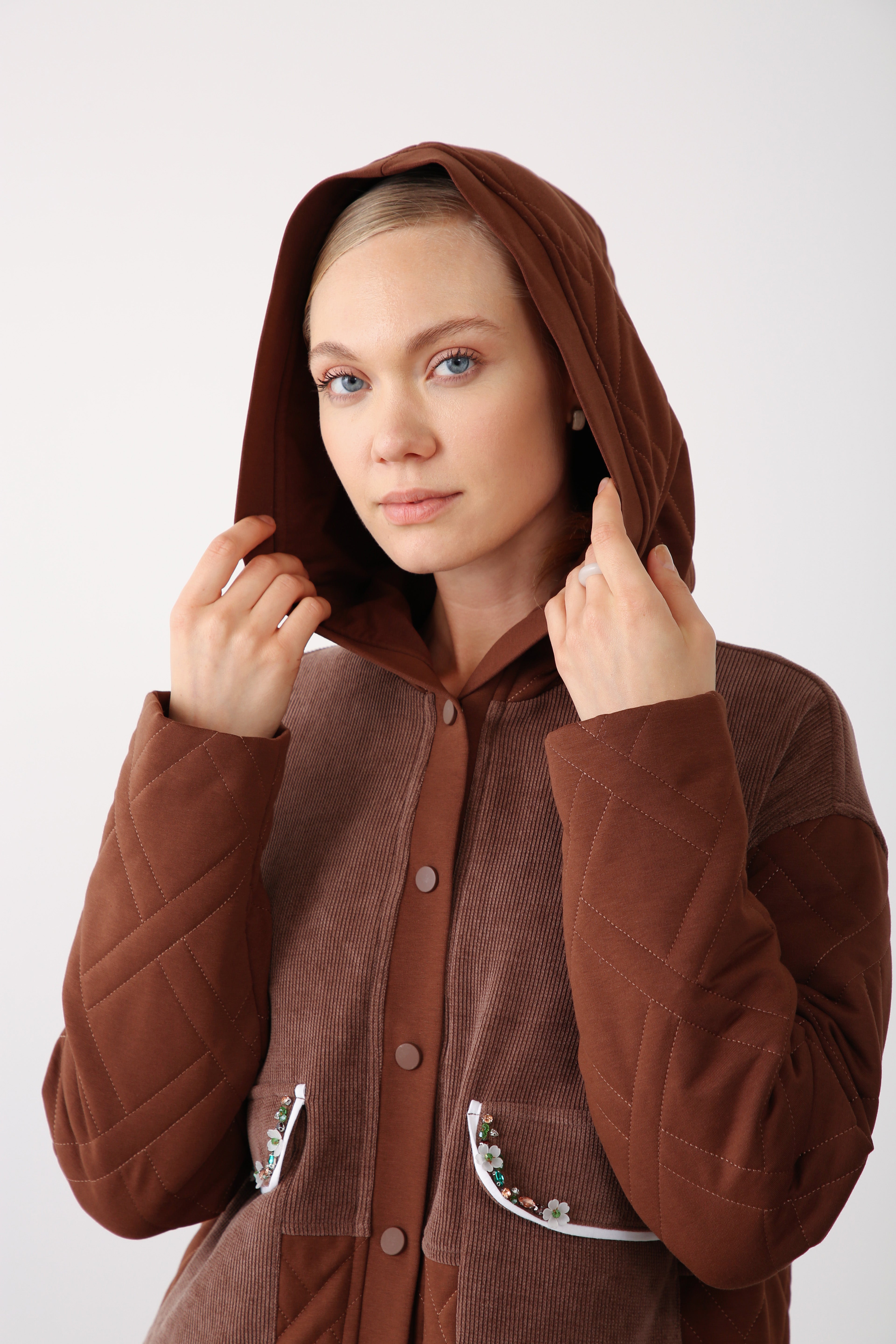 This brown quilted jacket redefines comfort with elegance. Made from two-thread fabric and accented with corduroy textures, it features delicate bead embroidery that gives a handcrafted, artistic charm. The hood and flap pockets provide warmth and practicality, while the geometric quilting ensures a tailored, polished appearance.
