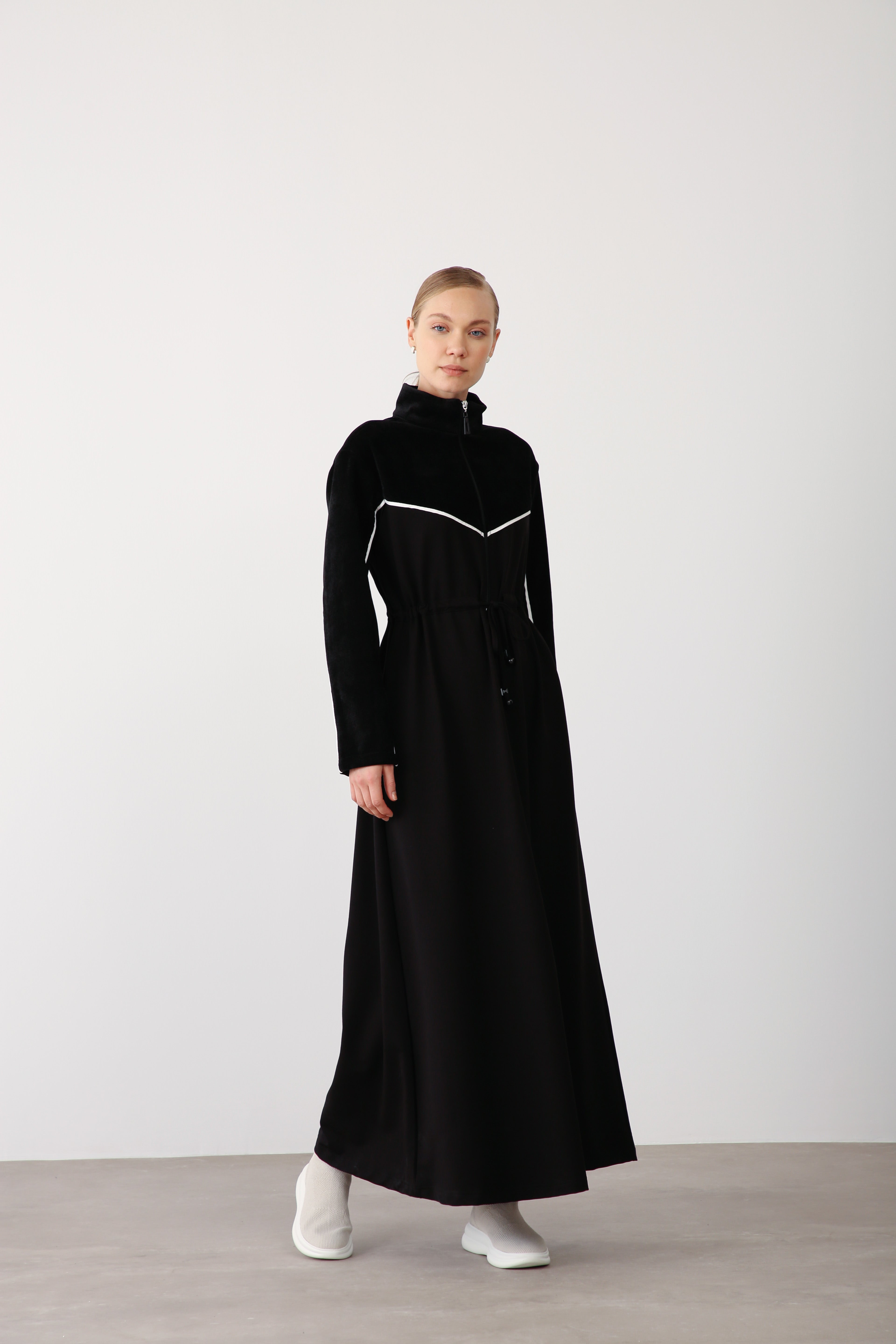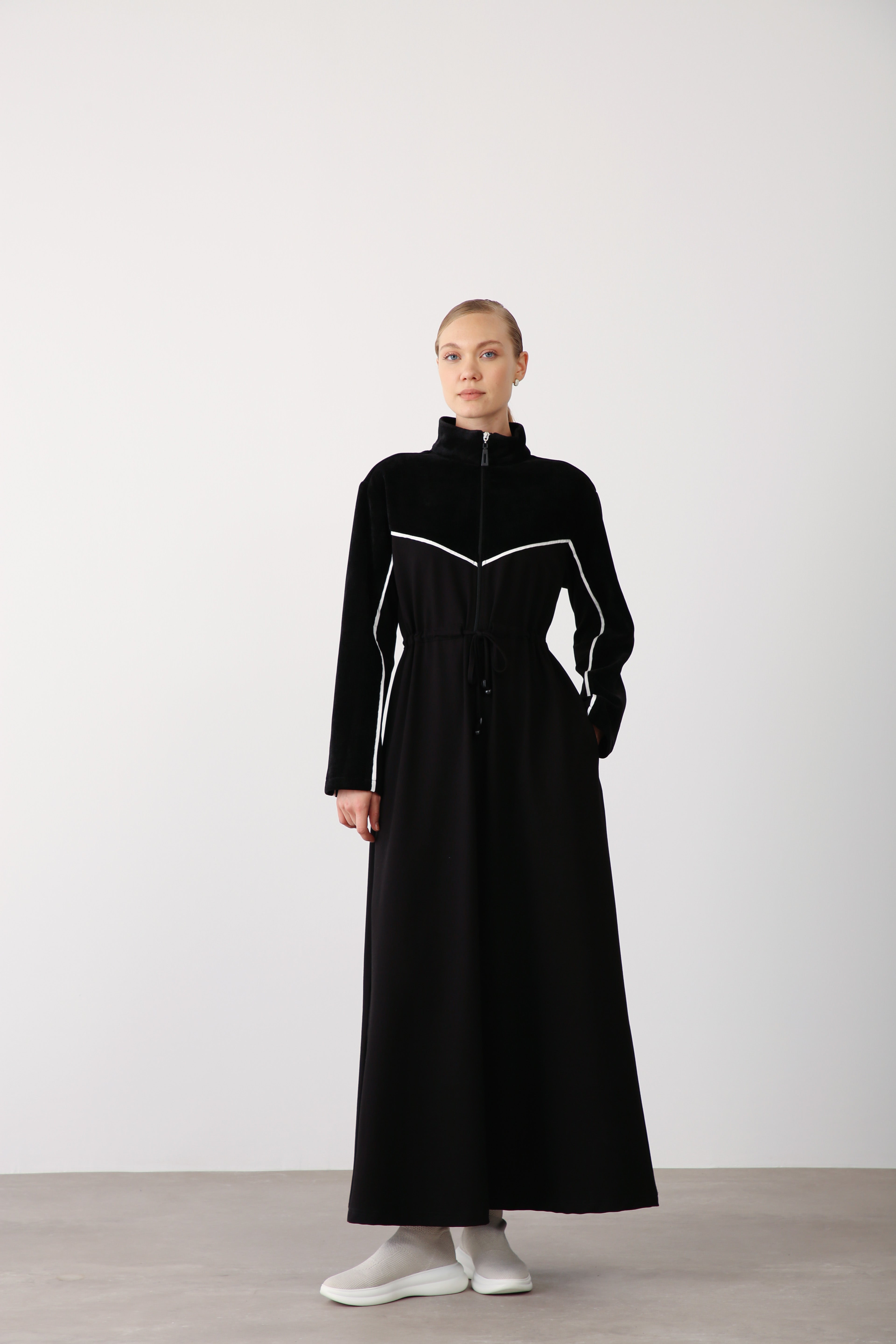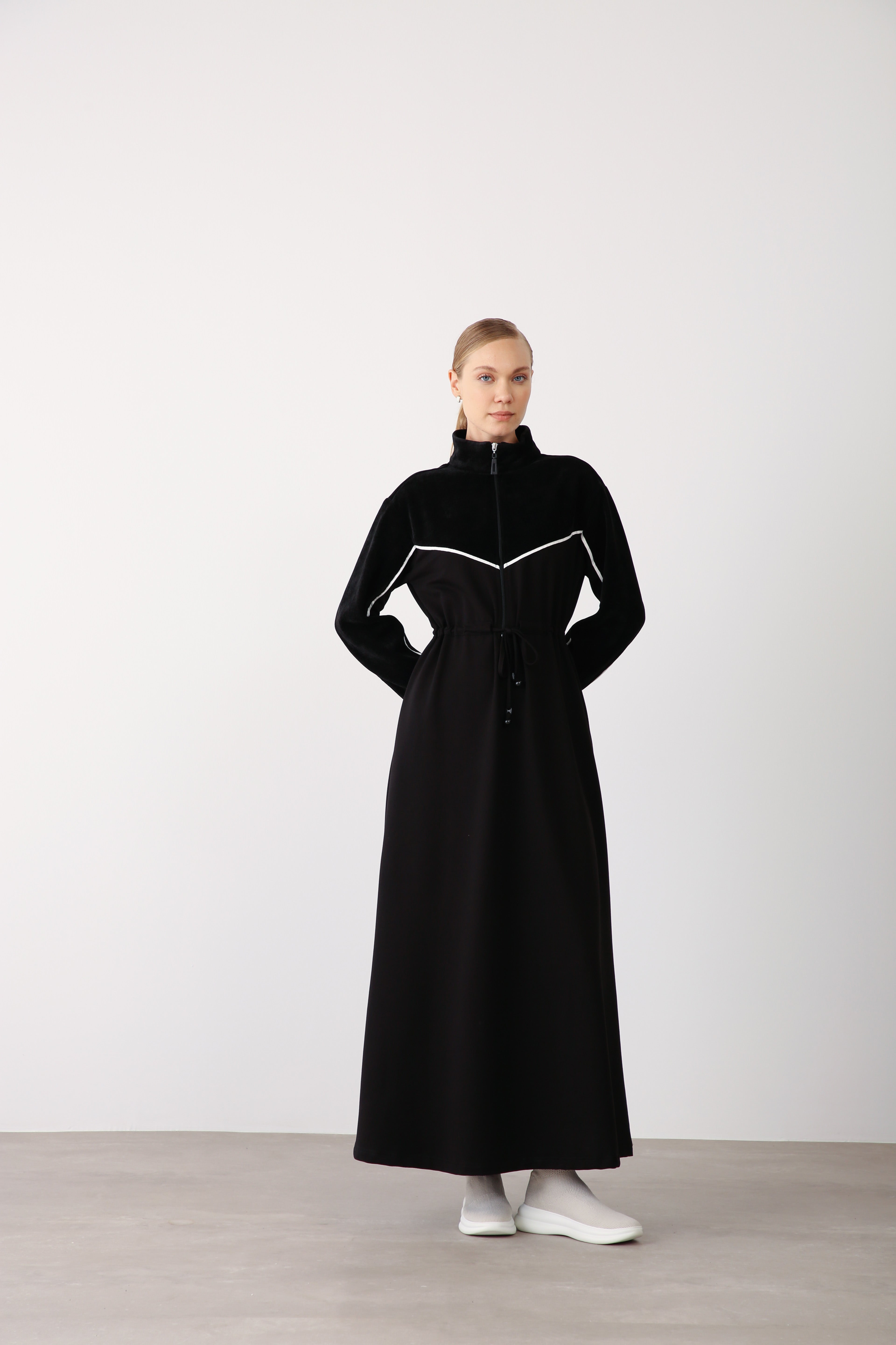 This full-length dress is crafted from a premium two-thread fabric, designed to offer both durability and a soft, comfortable feel for everyday wear. The structured silhouette is complemented by a high stand-up collar and a front zipper closure, making it versatile enough for various retail collections. Its adjustable drawstring waist provides a customizable fit, enhancing body shape and broadening the appeal to a wide range of customers.