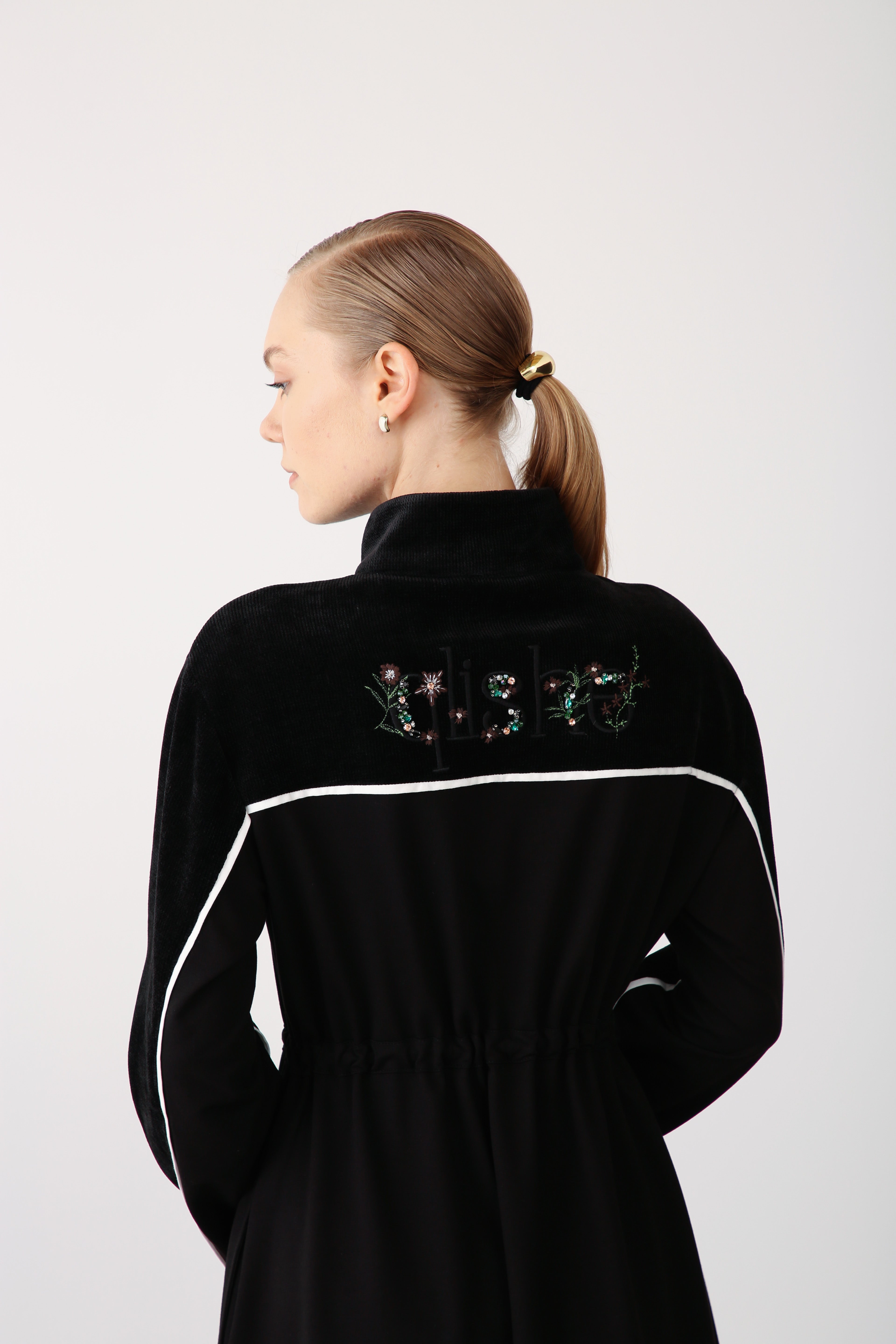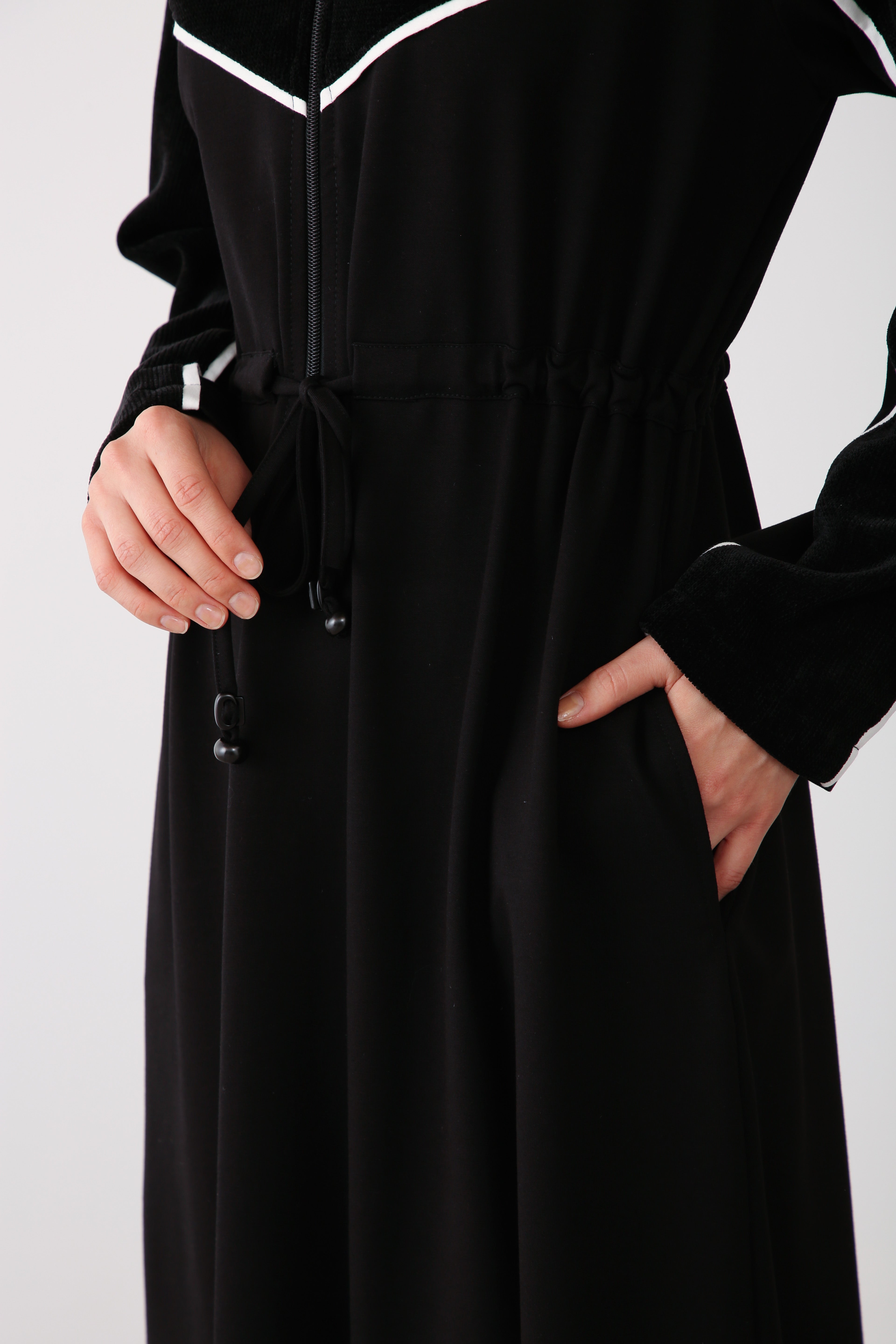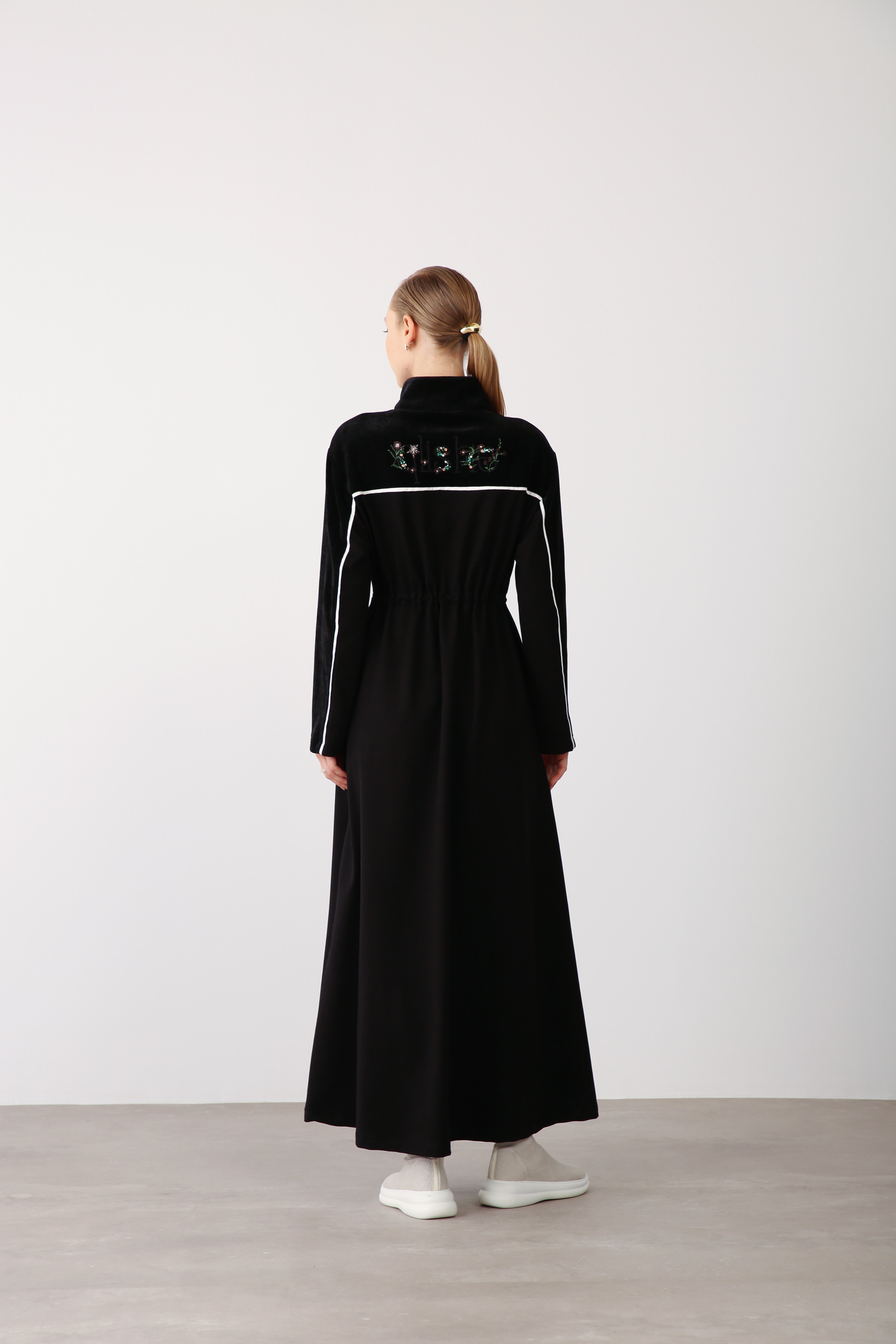 This full-length dress is crafted from a premium two-thread fabric, designed to offer both durability and a soft, comfortable feel for everyday wear. The structured silhouette is complemented by a high stand-up collar and a front zipper closure, making it versatile enough for various retail collections. Its adjustable drawstring waist provides a customizable fit, enhancing body shape and broadening the appeal to a wide range of customers.