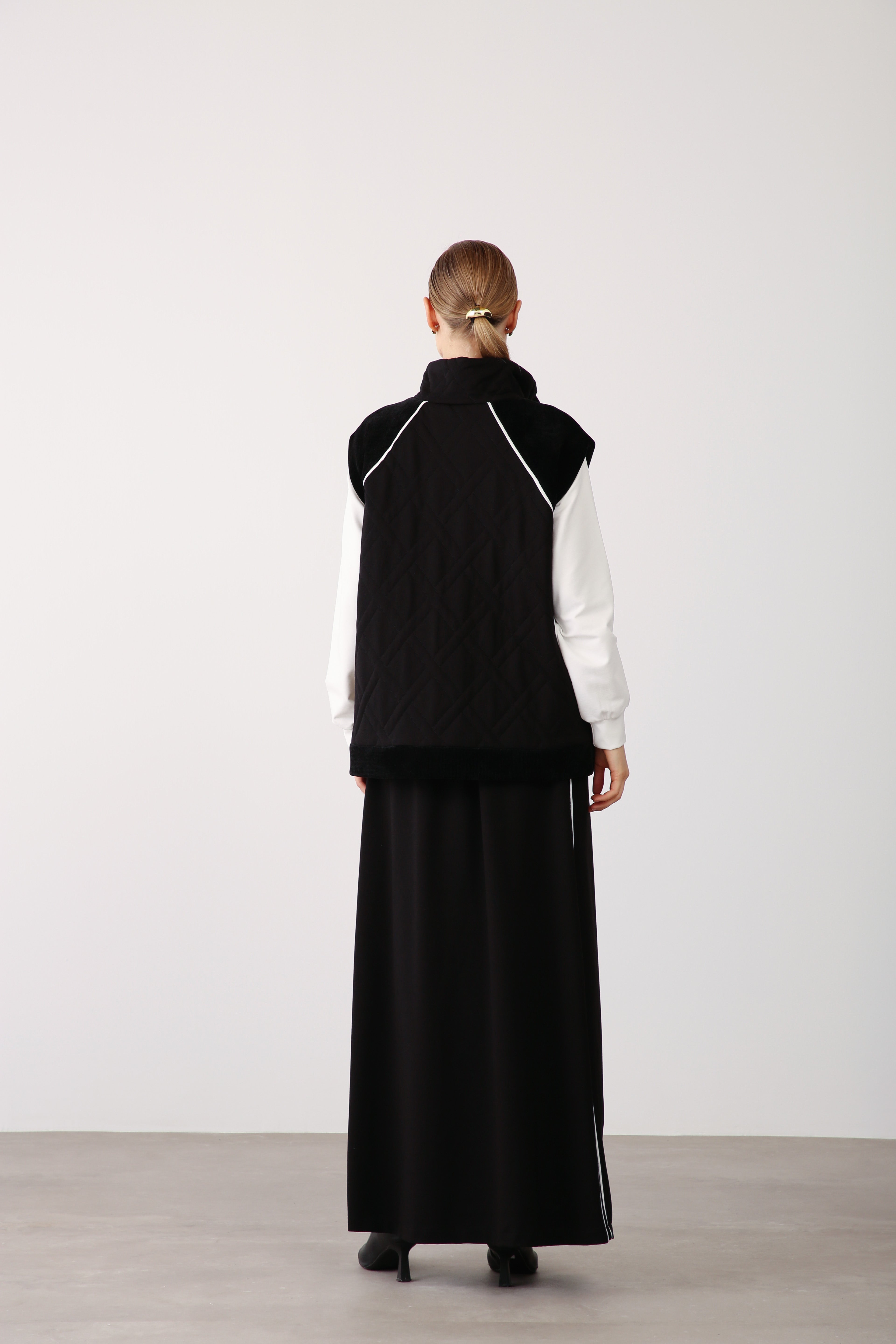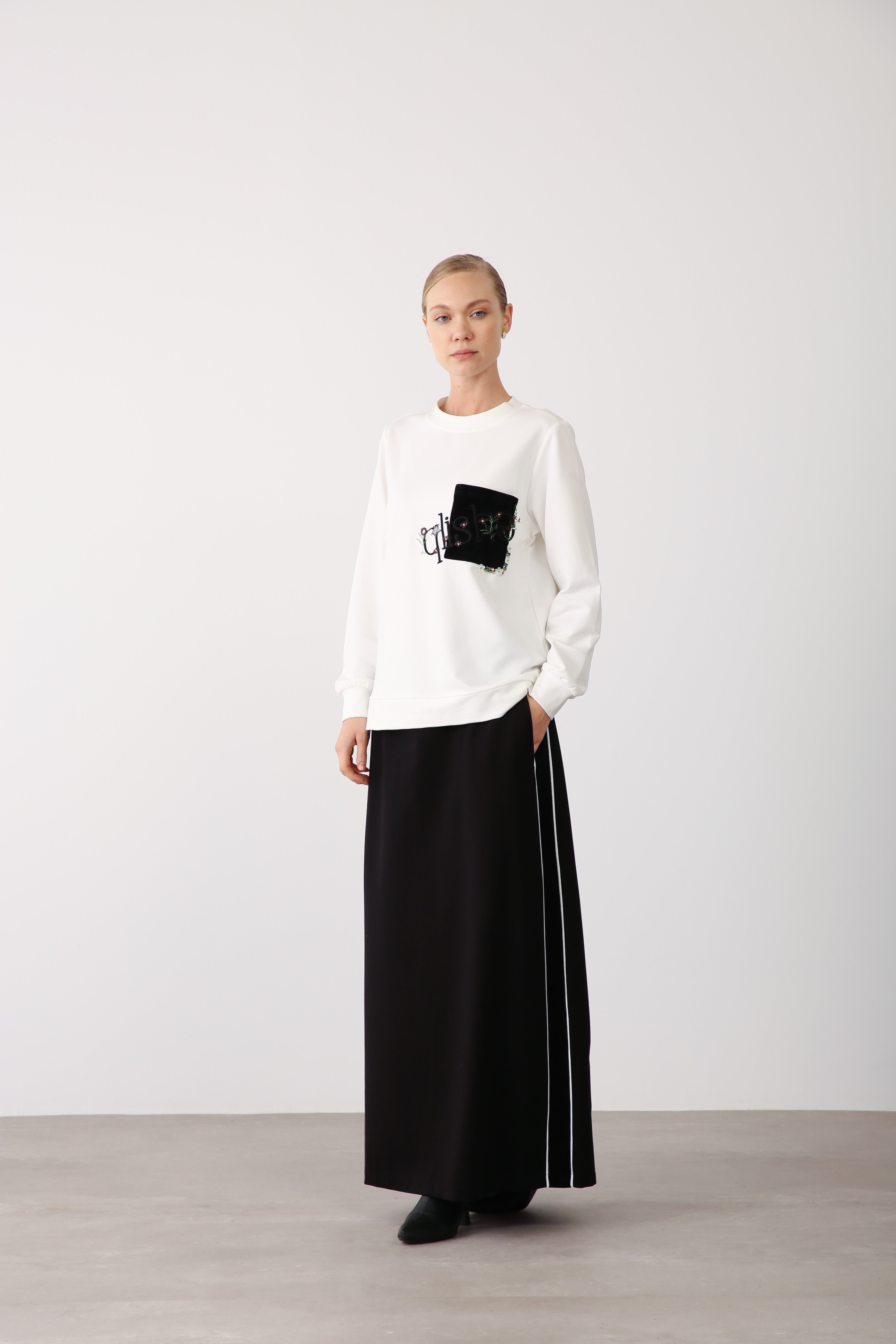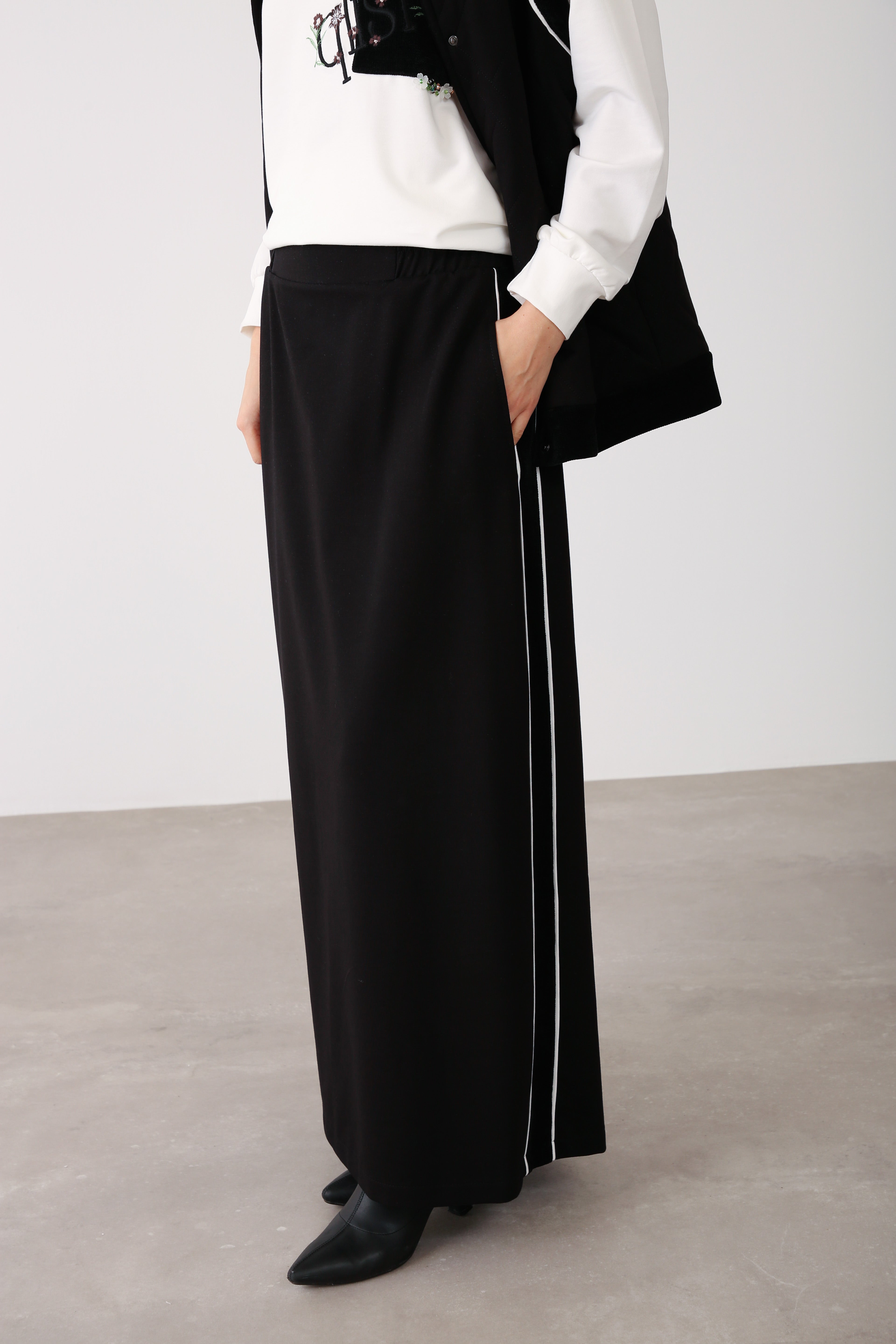 This black long skirt, designed in smooth two-thread fabric, is a versatile wardrobe foundation for elegant wholesale collections. Its side stripe detail adds a subtle dynamic accent, while the elastic waistband ensures comfort and adaptability. The structured flow of the fabric enhances posture and offers a clean, elongated appearance suitable for both everyday wear and elevated styling.