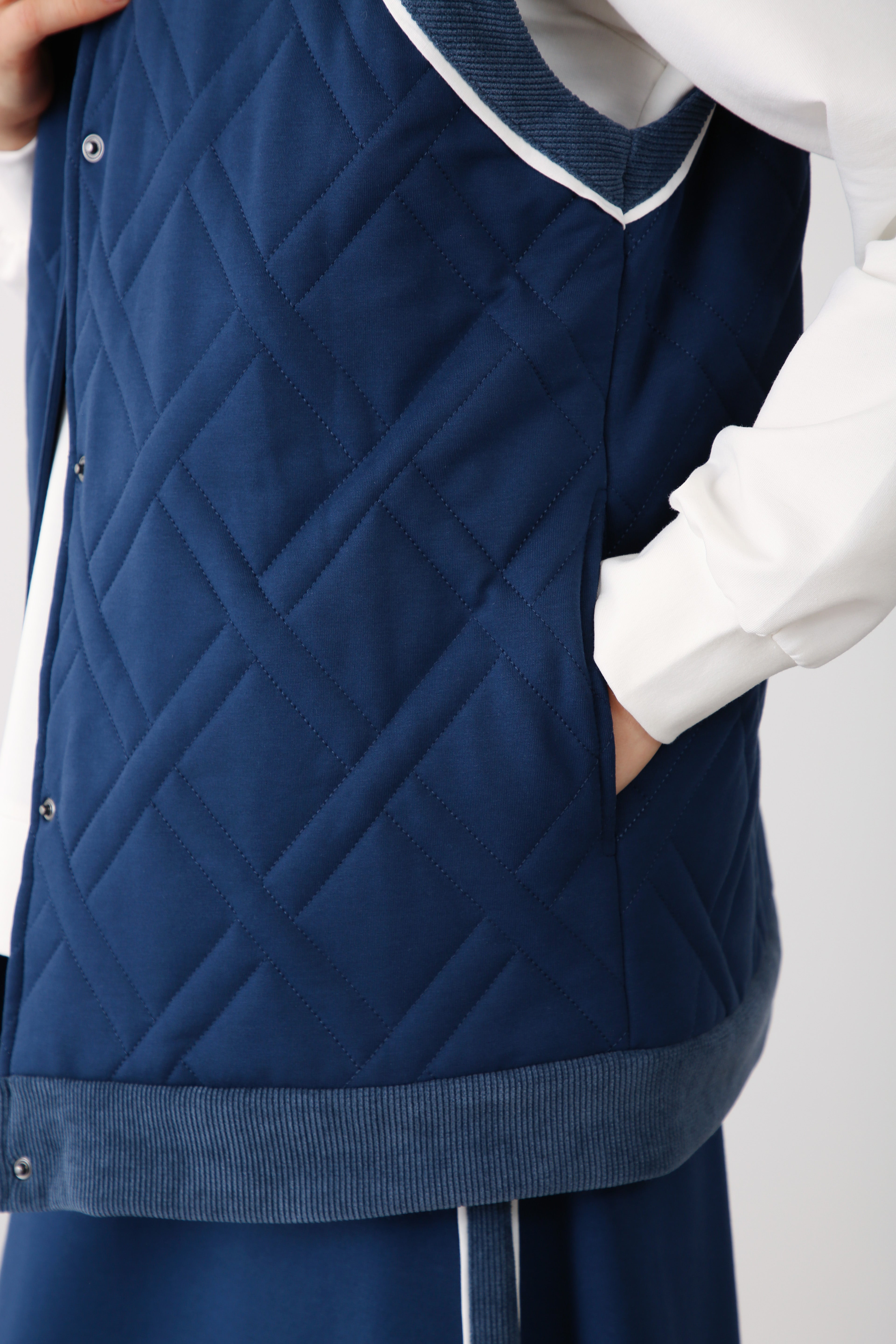 This indigo quilted vest, designed in two-thread fabric, is the perfect layering piece for boutique buyers seeking elegance with practicality. Its diamond-stitched pattern enhances form and insulation, while the high collar offers a sleek, modern edge. The soft interior lining and front snap closures ensure comfort and ease of wear, creating a piece that feels luxurious yet versatile.